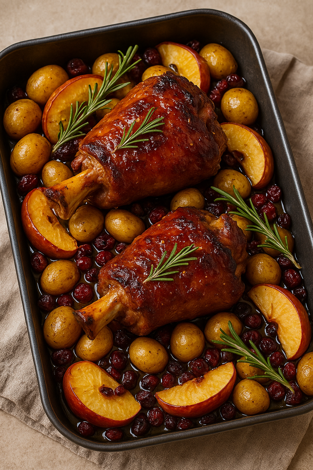 Τρυφερό κρέας που λιώνει, παιδικές πατάτες που έχουν τραβήξει όλο τον χυμό του ταψιού, μήλα που έγιναν σχεδόν μαρμελάδα και κόκκινες πινελιές από τα κράνμπερις. Ένα πιάτο που ζεσταίνει την καρδιά και το τραπέζι.