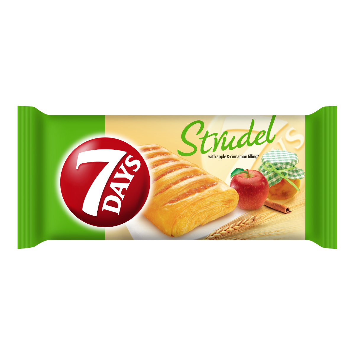 Ανακάλυψε το 7Days Strudel με λαχταριστή γέμιση μήλο-κανέλα και αφράτη ζύμη από 4 δημητριακά. Η αφράτη ζύμη και η πλούσια γέμιση κάνουν το 7Days Strudel το απόλυτο σνακ για κάθε στιγμή της ημέρας. Σε πρακτική συσκευασία για την εκδρομή ή τη δουλειά για ένα γρήγορο και γευστικό σνακ!
