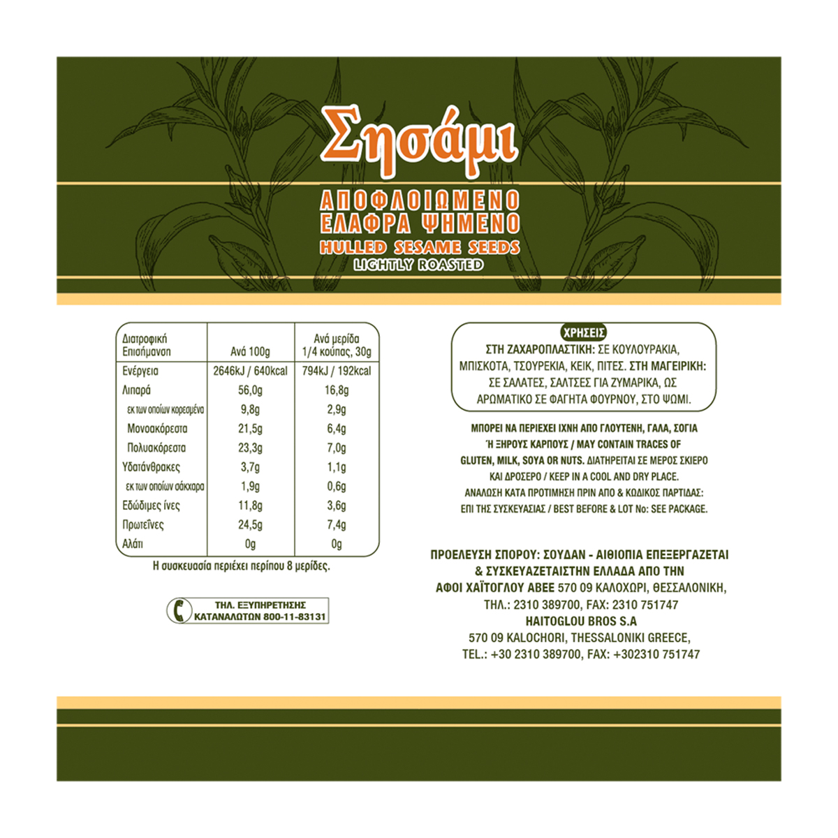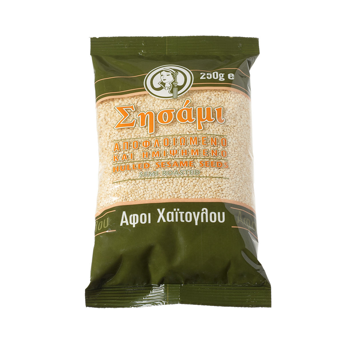 Οι καλύτερες ποικιλίες σησαμιού προέλευσης Σουδάν - Αιθιοπίας, αποφλοιωμένες μόνο με μηχανικά μέσα, ακολουθώντας τις αυστηρότερες προδιαγραφές ποιότητας και ασφάλειας. Σησάμι εξαιρετικής καθαρότητας κατάλληλο για κάθε χρήση. Αναδεικνύει την γεύση και την εμφάνιση κάθε μαγειρικής και αρτοζαχαροπλα-στικής δημιουργίας. Νέα πρακτική συσκευασία τροποποιημένης ατμόσφαιρας που διατηρεί αναλλοίωτη την φρεσκάδα και την γεύση του σησαμιού. Παράγεται στην Ελλάδα στις εγκαταστάσεις μας.