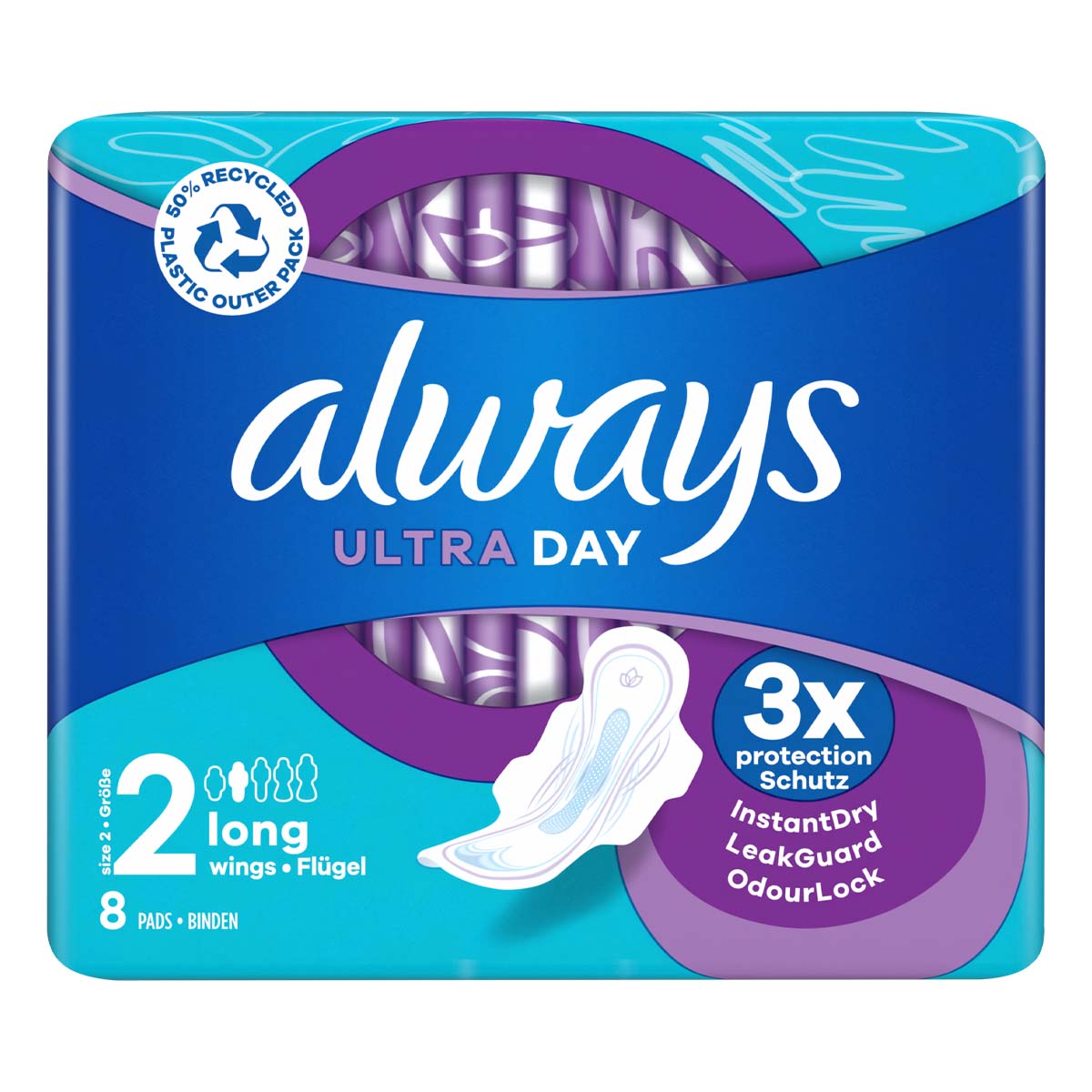 Μην συμβιβάζεστε με λιγότερο από 3x προστασία με τις σερβιέτες με φτερά Always Ultra Long (Μέγεθος 2) για την ημέρα. Οι σερβιέτες Always απορροφούν σε δευτερόλεπτα χάρη στην τεχνολογία InstantDry, και αποτρέπουν οσμές & διαρροές χάρη στις τεχνολογίες φράγμα LeakGuard και OdorLock. Τα μοναδικά φτερά ComfortLock έχουν σχεδιαστεί για καλύτερη εφαρμογή σε οποιοδήποτε είδος εσωρούχων (σε σχέση με το προηγούμενο προϊόν). Για έξτρα προστασία τη νύχτα, δοκιμάστε την Always Ultra Size 5. Οι σερβιέτες Always είναι δερματολογικά εγκεκριμένες από τη Skin Health Alliance.