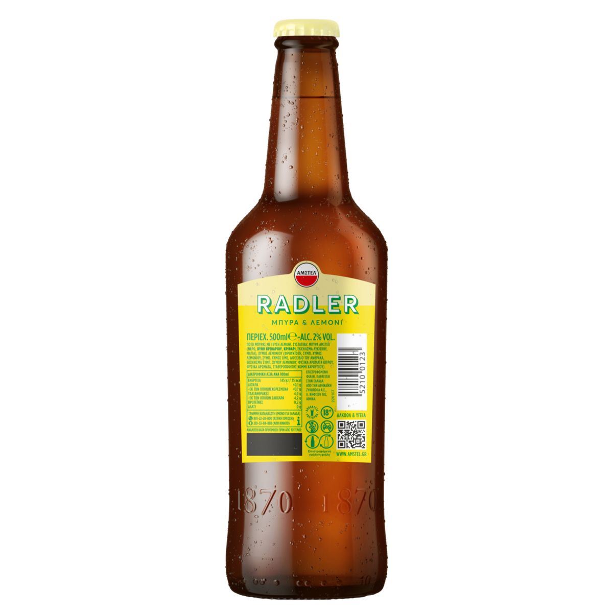 ΔΙΠΛΑ ΔΡΟΣΙΣΤΙΚΗ, ΔΙΠΛΑ ΑΠΟΛΑΥΣΤΙΚΗ! Απολαυστική σαν μπίρα, δροσιστική σαν λεμονάδα και μόνο με 2% αλκοόλ. Αυτή είναι η μπύρα AMSTEL Radler Lemon. Χυμός από ζουμερά ελληνικά λεμόνια αναμιγνύεται με μπύρα AMSTEL σε μία φυσικά αναζωογονητική γεύση, που θα σε ξεδιψάσει. Η όψη της είναι θολή λόγω της ανάμειξης, η αίσθησή της διπλά απολαυστική. Πίνεται παγωμένη, πίνετε άλλη μία γουλιά – γιατί είναι ωραία η δροσιά!