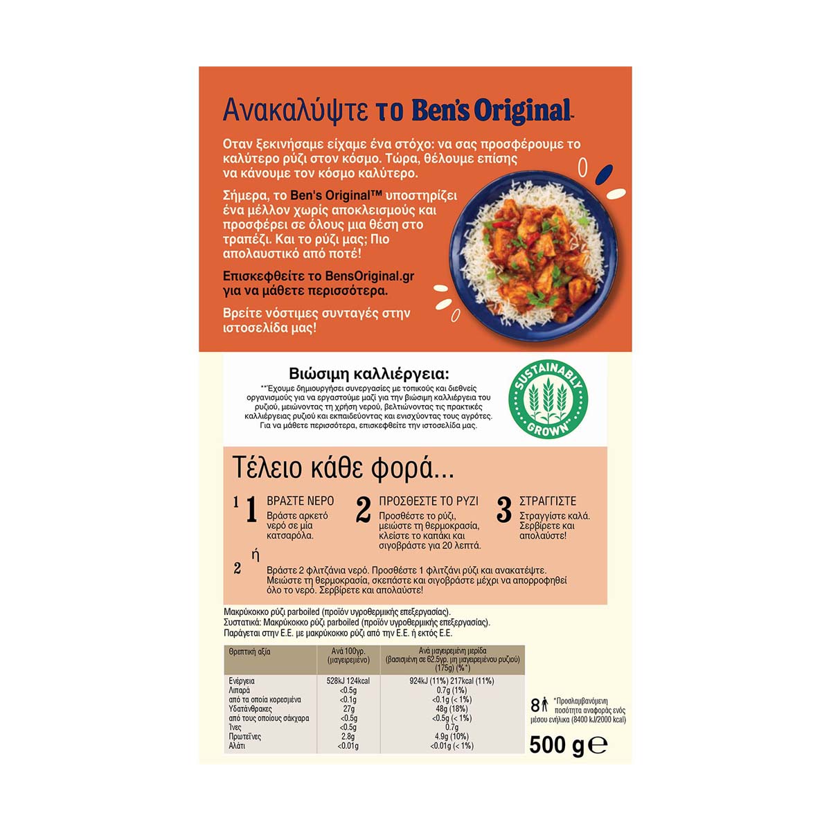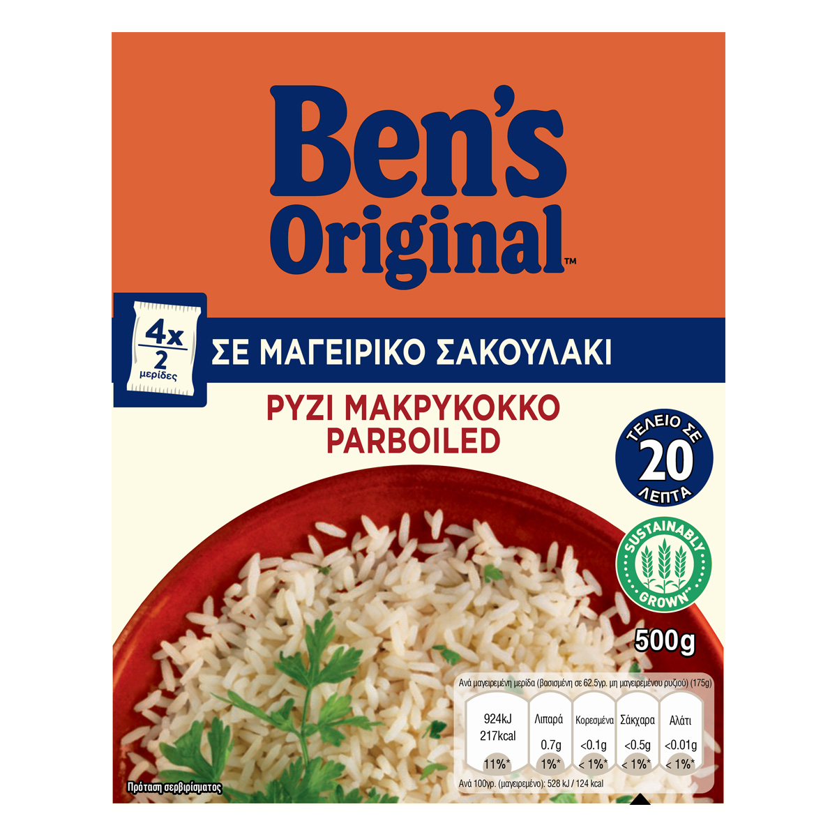 BEN'S ORIGINAL™ 20λεπτο μακρύκοκκο ρύζι σε μαγειρικό σακουλάκι για τέλειο ρύζι, χωρίς μέτρημα και σούρωμα. Tο πρώτο σπυρωτό ρύζι στην Ελληνική αγορά. Χάρη στην επεξεργασία του parboiling διατηρείται πάντα σπυρωτό. Κατάλληλο για χορτοφάγους. Η συσκευασία αυτή περιέχει μόνο προσεκτικά επιλεγμένο, υψηλής ποιότητας ρύζι. Ταιριάζει ιδανικά ως συνοδευτικό με κρέας, ψάρι, κοτόπουλο και γαρίδες. *Ενημερωτική σημείωση προς καταναλωτές: Το ρύζι από τη φύση του δεν περιέχει γλουτένη.
