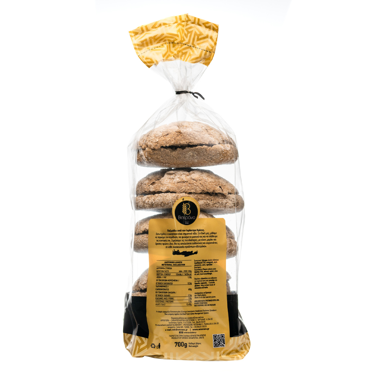 Ζυμωμένο με τον πλέον παραδοσιακό τρόπο και ψημένο σε ξυλόφουρνο. Από σιτάρι και κριθάρι ολικής άλεσης χωρίς καμία πρόσθετη επεξεργασία, καθώς και με αγνό παρθένο ελαιόλαδο. Προϊόν υψηλής διατροφικής αξίας, πλούσιο σε φυτικές ίνες που διασφαλίζουν την σωστή λειτουργία του εντέρου.