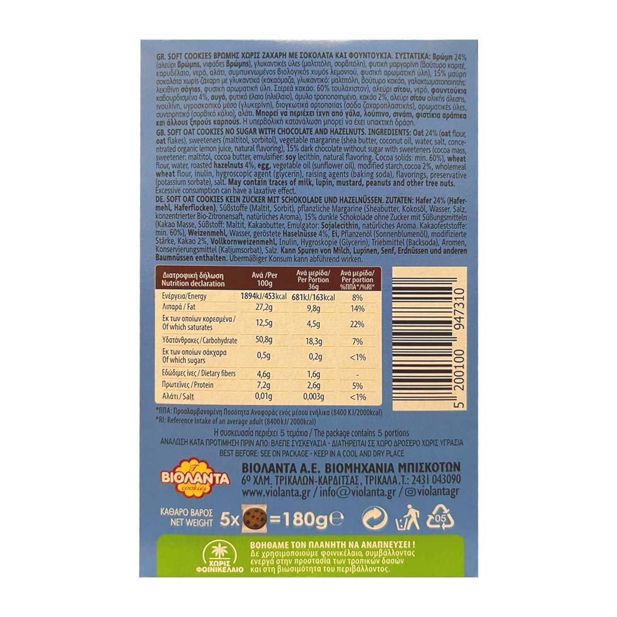 Βιολάντα Soft Cookies Μπισκότα Βρώμης Με Μαύρη Σοκολάτα & Φουντούκια Χωρίς Ζάχαρη 180 gr