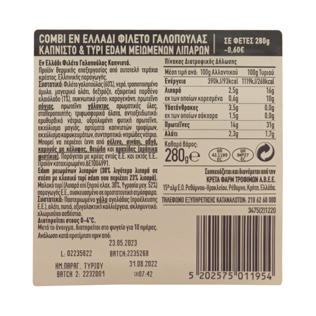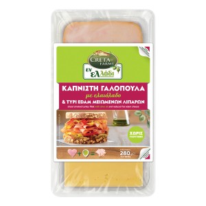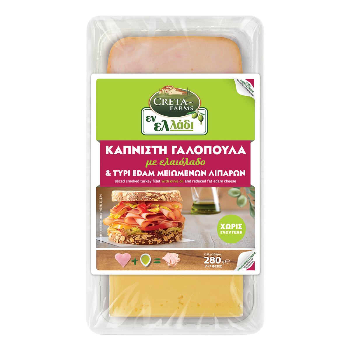 Καπνιστή γαλοπούλα με εξαιρετικό παρθένο ελαιόλαδο και τυρί Edam με μειωμένα λιπαρά, εκλεκτής ποιότητας, σε φέτες, σε μια πρακτική διπλή συσκευασία. Χάρη στην πρωτοποριακή τεχνολογία της διπλής παστερίωσης, διατηρείται αναλλοίωτη η γεύση και τα θρεπτικά συστατικά του αλλαντικού με φυσικό τρόπο.