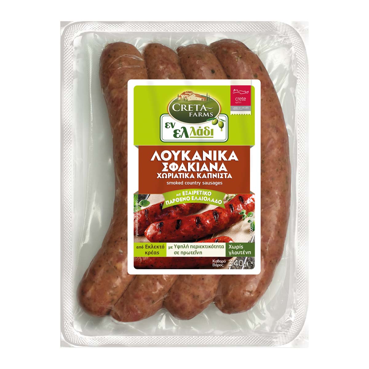 Χωριάτικα, λαχταριστά λουκάνικα με αυθεντική συνταγή, εμπνευσμένη από τα Σφακιά. Εκλεκτό χοιρινό κρέας αναμειγνύεται με εξαιρετικά παρθένο ελαιόλαδο και κρητικά βότανα, τυλίγεται σε φυσικό έντερο και καπνίζεται σε ξύλα οξιάς, προσφέροντας πλούσια καπνιστή γεύση και μοναδικό άρωμα. Υψηλή περιεκτικότητα σε πρωτεΐνη και χωρίς γλουτένη.