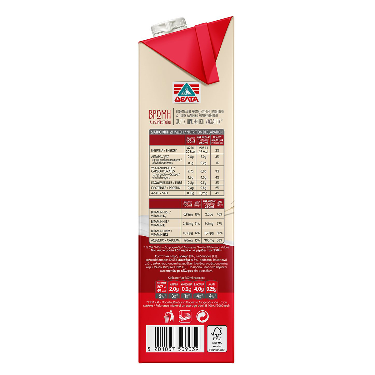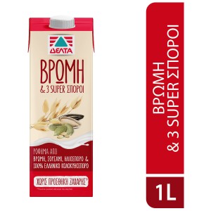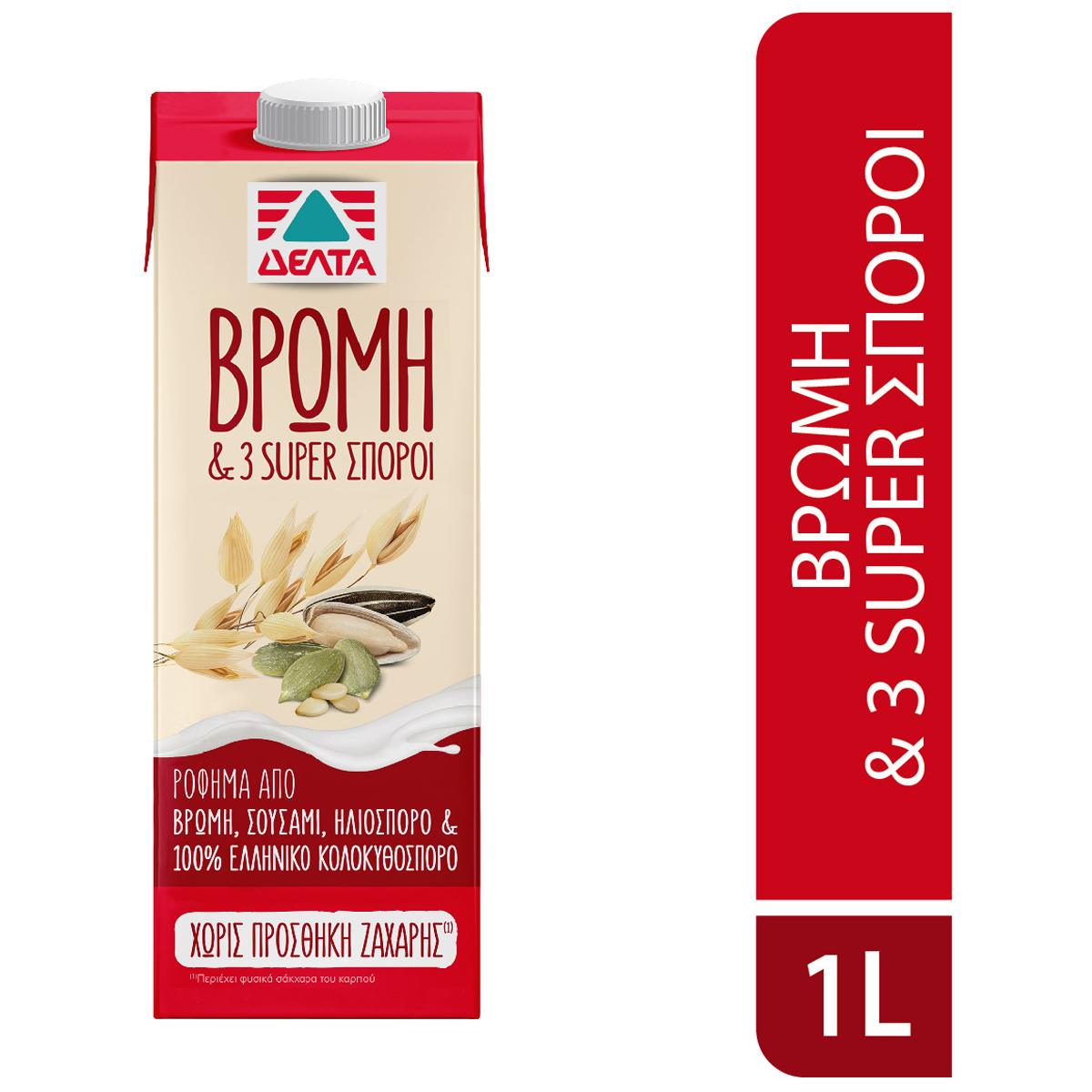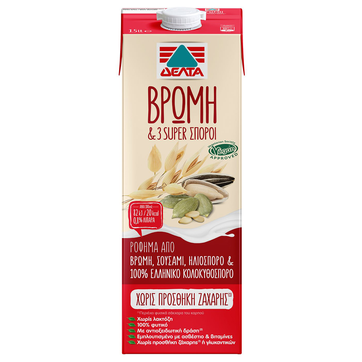 Το ΔΕΛΤΑ ρόφημα Βρώμη & 3 Super Σπόροι είναι ένα 100% φυτικό ρόφημα Βρώμης με Σουσάμι, Ηλιόσπορο και 100% ελληνικό Κολοκυθόσπορο, αντιοξειδωτική δράση, εμπλουτισμένο με ασβέστιο και βιταμίνες, κατάλληλο για χορτοφάγους και για περιόδους νηστείας. Χωρίς λακτόζη και χωρίς προσθήκη ζάχαρης ή άλλων γλυκαντικών.