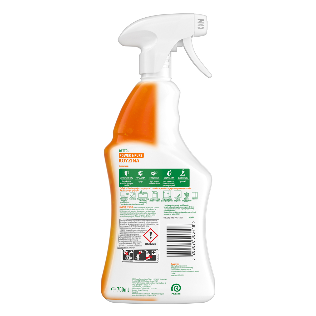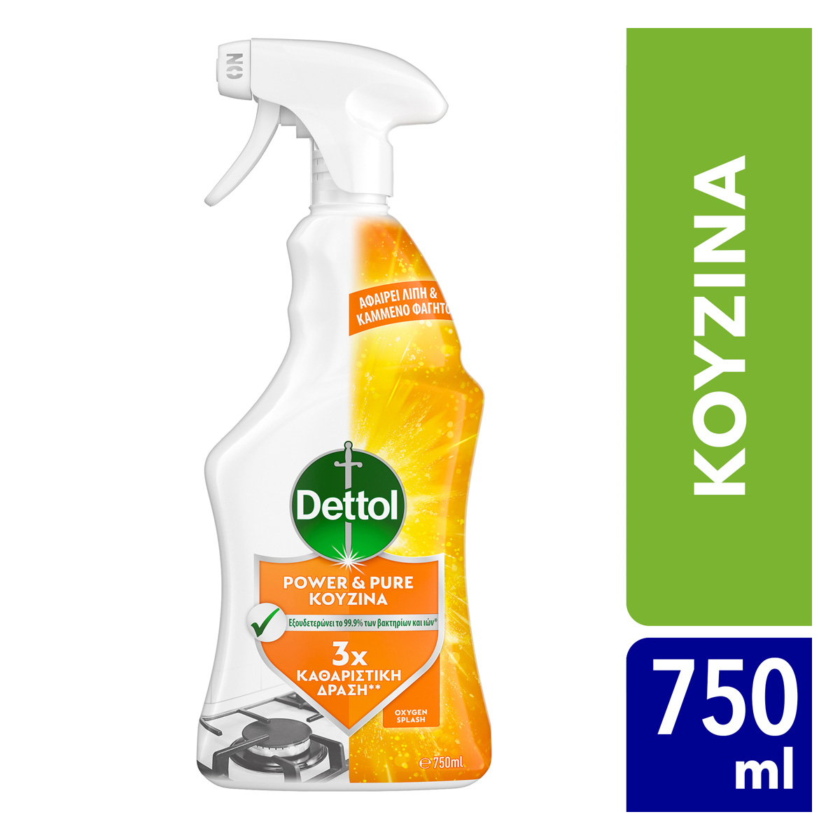 Το καθαριστικό spray κουζίνας Dettol Power & Pure είναι ιδανικό για την αντιμετώπιση των δύσκολων εργασιών καθαρισμού της κουζίνας. Υγιεινή καθαριότητα χωρίς συμβιβασμούς. Ισχυρός καθαρισμός –η φόρμουλα ενεργού οξυγόνου διεισδύει και διαλύει τα άλατα, υπολείμματα σαπουνιού και την βρωμιά χωρίς να χρειάζεται ξεβγαλμα. Ενώ είναι σκληρό με τη βρωμιά, εξουδετερώνει και το 99,9% των βακτηρίων, συμπεριλαμβανομένου του E. coli και του ιού της γρίπης (H1N1) κάνοντας έτσι τον καθαρισμό της κουζίνας σας εύκολη υπόθεση.