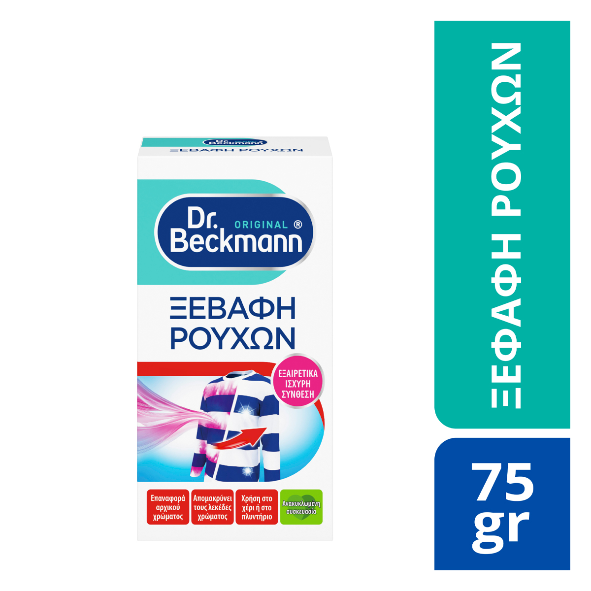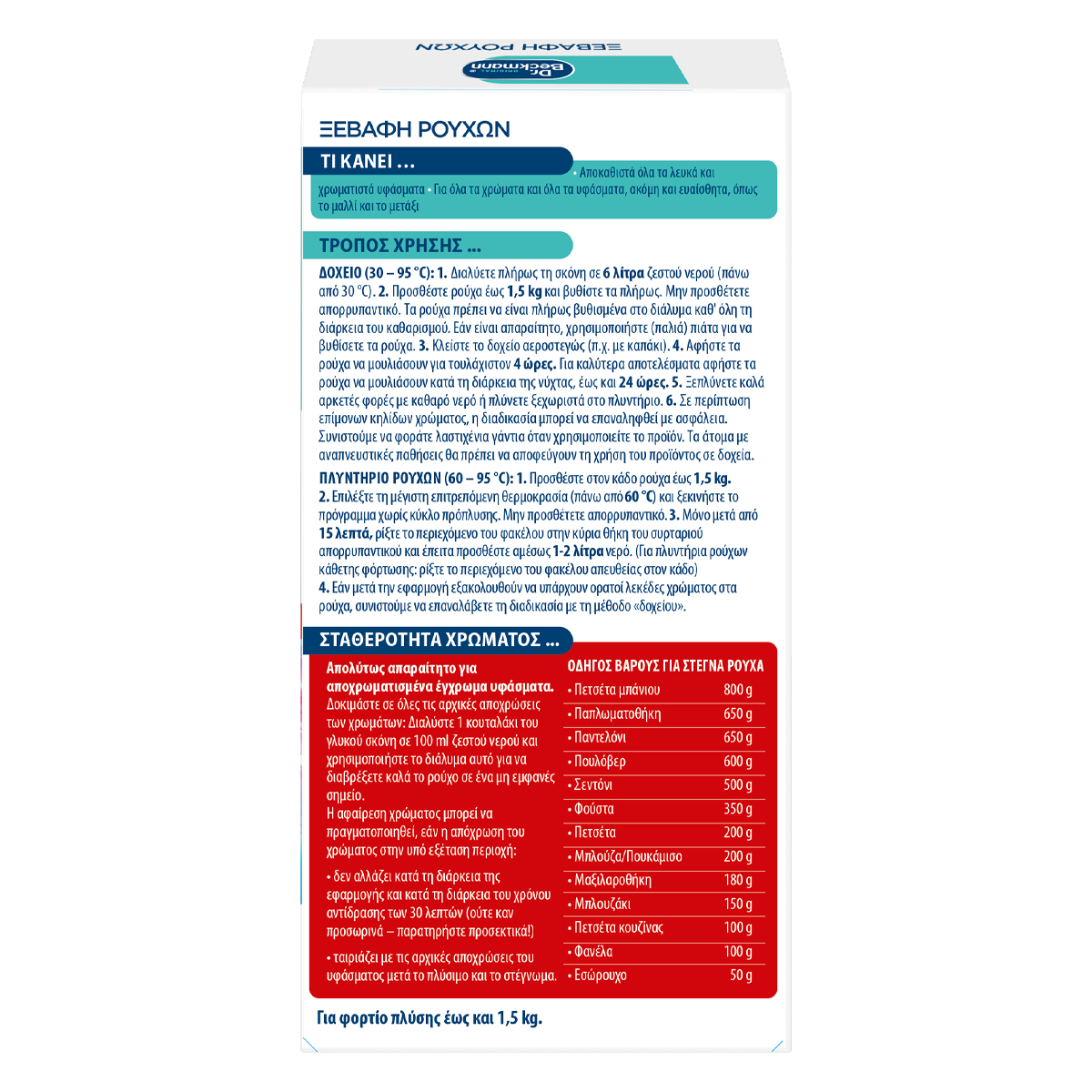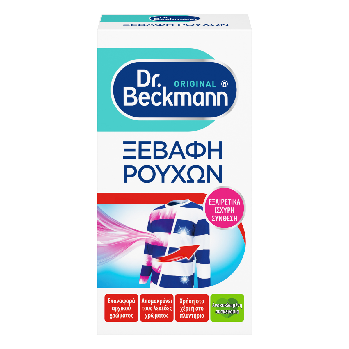 Τα έντονα χρωματιστά ρούχα μπορούν να προκαλέσουν γρήγορα αποχρωματισμούς όταν πλένονται λανθασμένα με άλλα ρούχα. Τα αρχικά χρώματα μπορούν να αποκατασταθούν με το Dr. Beckmann Ξεβαφή Ρούχων. Ειδικά συστατικά αφαιρούν τους αποχρωματισμούς και εξαφανίζουν τα ανεπιθύμητα χρώματα. Ξαναδώστε ζωή στα ρούχα σας!