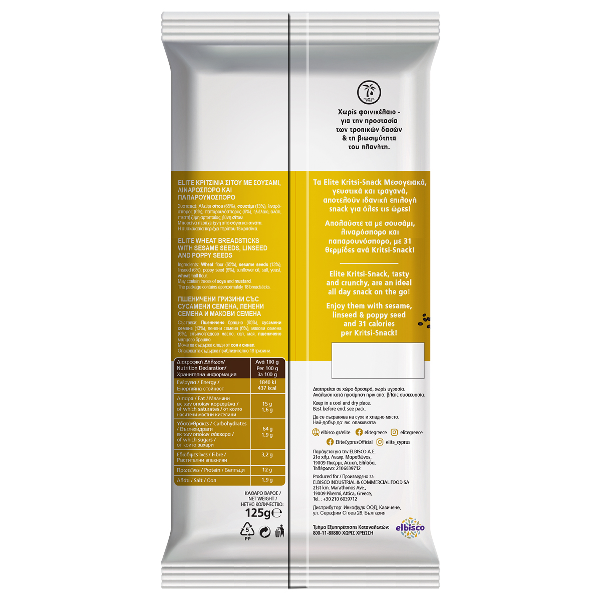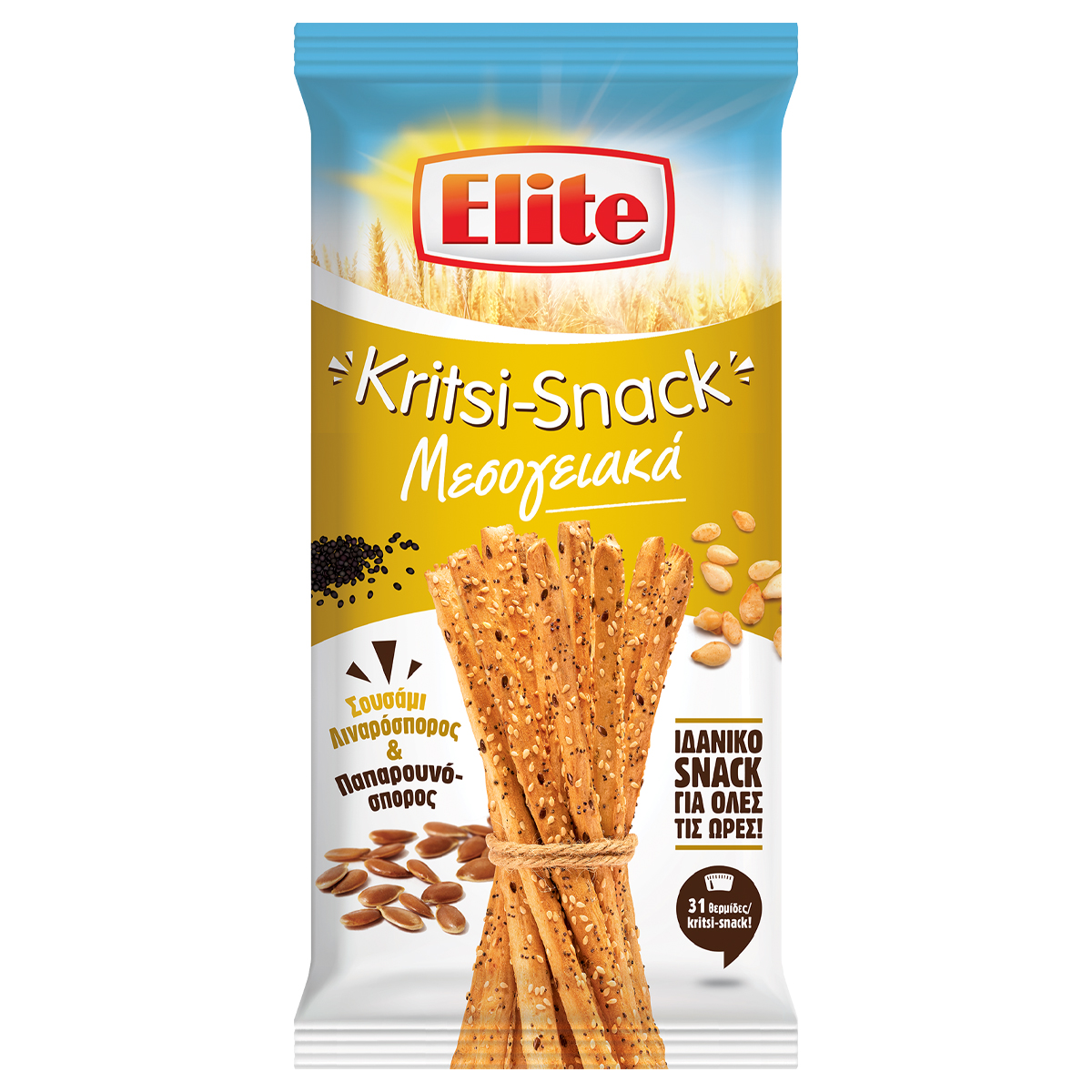 Τα Elite Kritsi-Snack Μεσογειακά, γευστικά και τραγανά, αποτελούν ιδανική επιλογή snack για όλες τις ώρες! Απολαύστε τα με σουσάμι, λιναρόσπορο και παπαρουνόσπορο, με 31 θερμίδες ανά Kritsi-Snack!