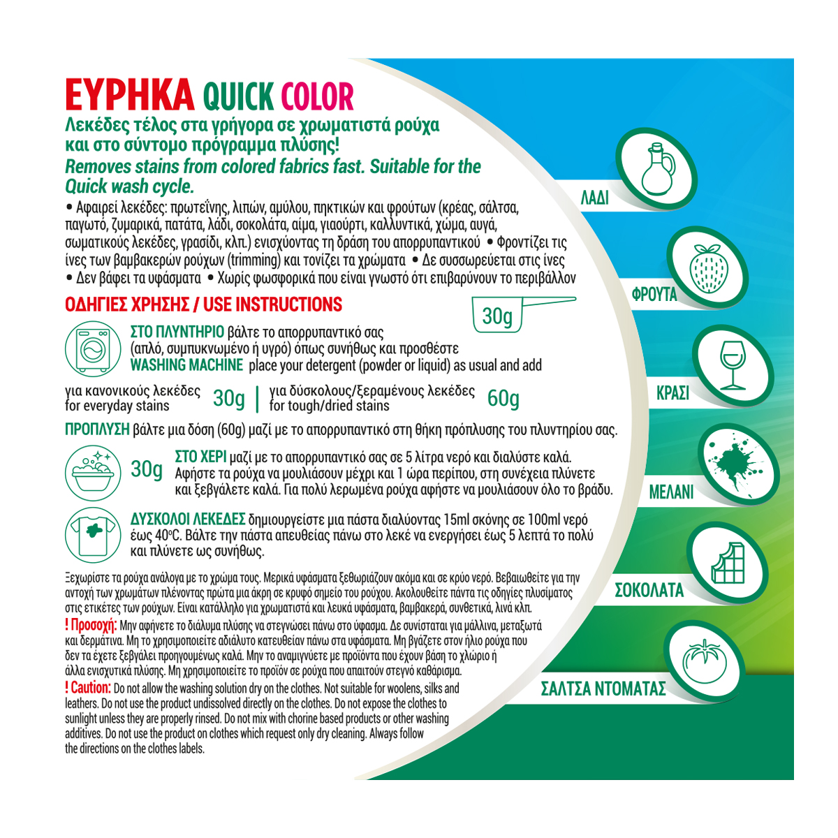 Ξεχωρίστε τα ρούχα ανάλογα με το χρώμα τους. Μερικά υφάσματα ξεθωριάζουν ακόμα και σε κρύο νερό. Βεβαιωθείτε για την αντοχή των χρωμάτων πλένοντας πρώτα μια άκρη σε κρυφό σημείο του ρούχου. Ακολουθείτε πάντα τις οδηγίες πλυσίματος στις ετικέτες των ρούχων. Είναι κατάλληλο για χρωματιστά και λευκά υφάσματα, βαμβακερά, συνθετικά, λινά κλπ.