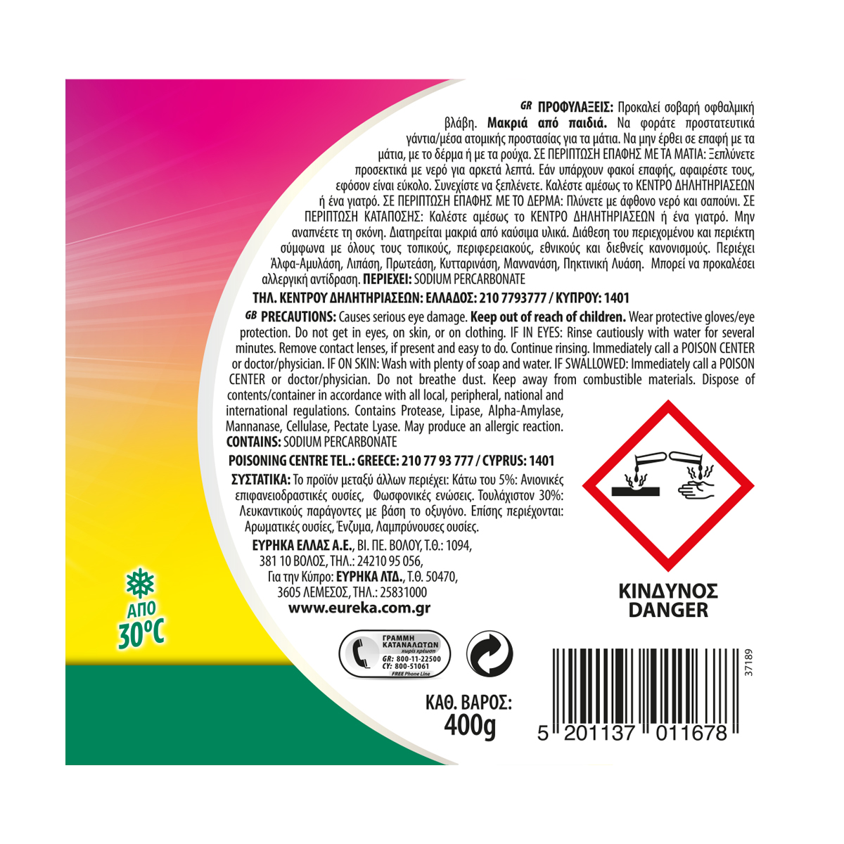 <5% Ανονικές επιφανειοδραστικές ουσίες, φωσφονικές ενώσεις, <30% λευκαντικούς παράγοντες με βάση το οξυγόνο, αρωματικές ουσίες, ένζυμα, λαμπρύνουσες ουσίες.