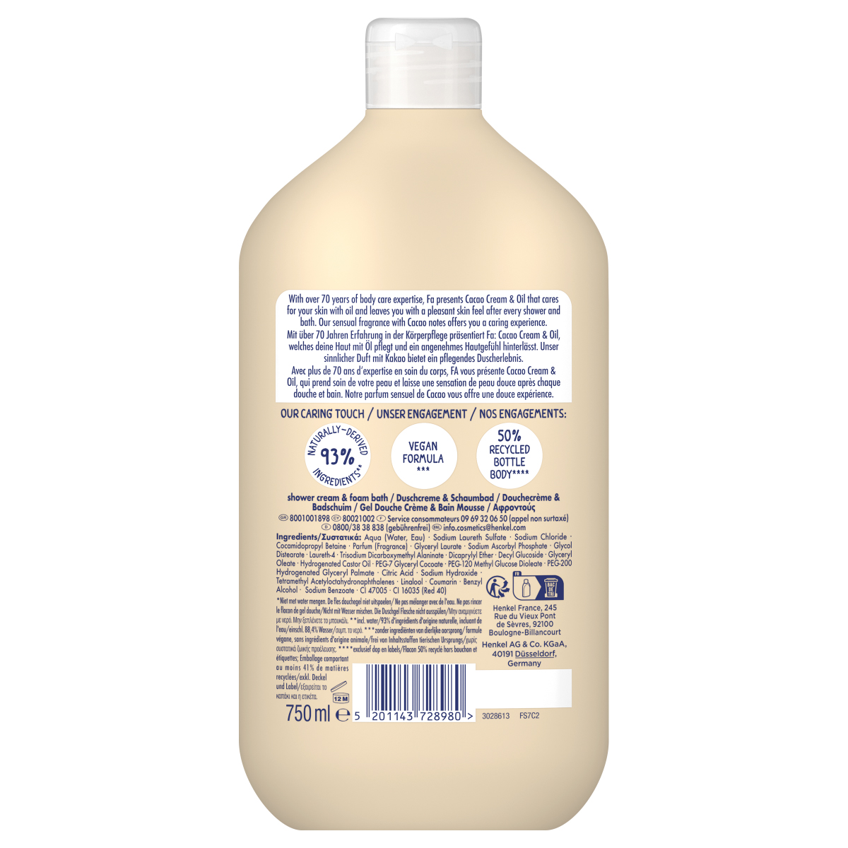 Τολμήστε να εξερευνήσετε το νέο Fa! Αναζωογονήστε το σώμα και το πνεύμα σας και αφήστε τις αισθήσεις σας να ανακαλύψουν έναν διαφορετικό κόσμο κάθε μέρα με το αφρόλουτρο Fa Cream & Oil Cacao με αγαπημένο άρωμα βούτυρο κακάο. ΔΙΑΛΕΞΤΕ ΤΗ ΔΙΑΘΕΣΗ ΣΑΣ: Πολύτιμο άρωμα βούτυρο κακάο. ΑΠΑΛΟ ΓΙΑ ΤΟ ΔΕΡΜΑ: Απαλή φόρμουλα με λάδι καρύδας. ΦΥΣΙΚΑ ΣΥΣΤΑΤΙΚΑ: έως 94% συστατικά φυσικής προέλευσης. VEGAN φόρμουλα. ΚΑΛΥΤΕΡΟ ΓΙΑ ΕΣΕΝΑ ΚΑΙ ΤΟΝ ΠΛΑΝΗΤΗ!