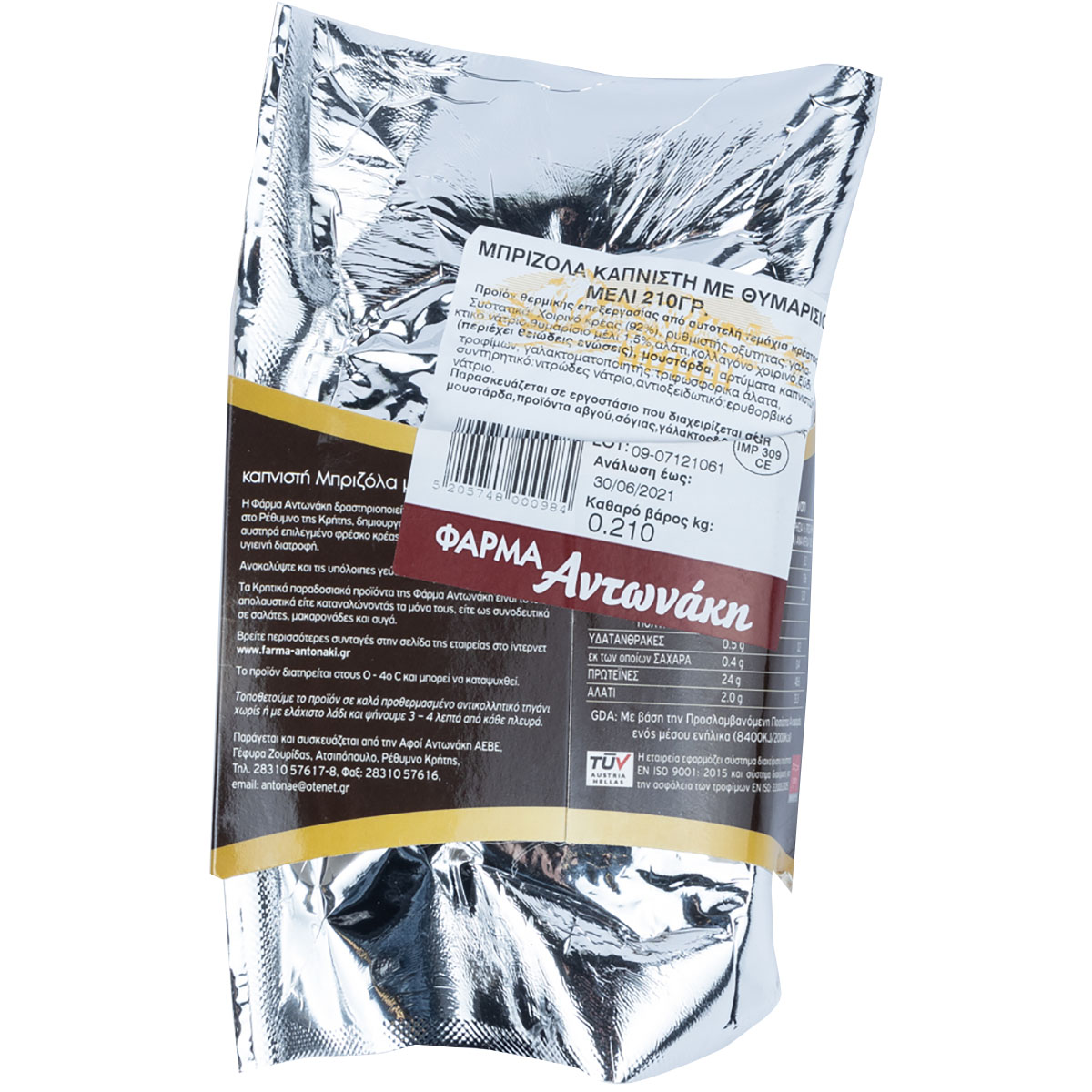 Εκλεκτό χοιρινό κρέας με μπαχαρικά, θυμαρίσιο μέλι και με ενδημικά φυτά της Κρήτης, καπνισμένο φυσικά σε αρωματικό ξύλο.