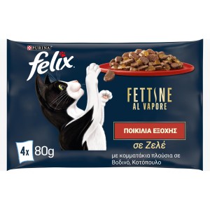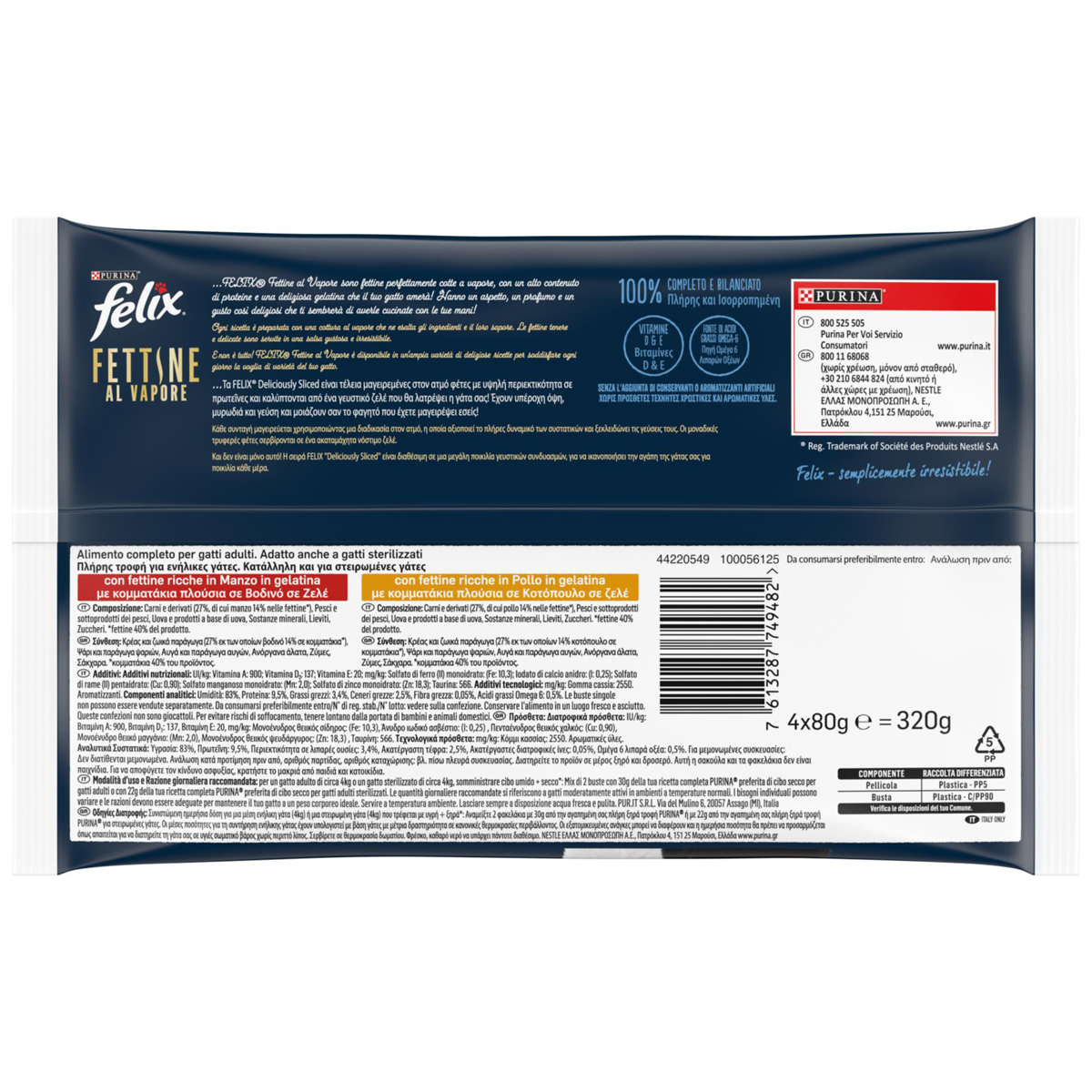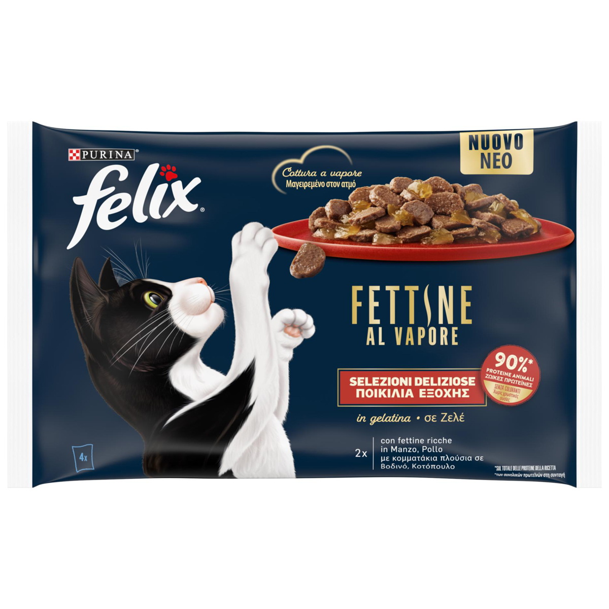 Φακελάκι υγρής τροφής για Γάτες. FELIX Πολυσυσκευασία Deliciously Sliced Κομματάκια σε ζελέ με Βοδινό & Κοτόπουλο 4x80g. Τα FELIX® Deliciously Sliced είναι τέλεια μαγειρεμένα στον ατμό φέτες με υψηλή περιεκτικότητα σε πρωτεΐνες και καλύπτονται από ένα γευστικό ζελέ που θα λατρέψει η γάτα σας! Έχουν υπέροχη όψη, μυρωδιά και γεύση και μοιάζουν σαν το φαγητό που έχετε μαγειρέψει εσείς! Κάθε συνταγή μαγειρεύεται χρησιμοποιώντας μια διαδικασία στον ατμό, η οποία αξιοποιεί το πλήρες δυναμικό των συστατικών και ξεκλειδώνει τις αλμυρές γεύσεις τους. Οι μοναδικές τρυφερές φέτες σερβίρονται σε ένα ακαταμάχητα νόστιμο ζελέ. Και δεν είναι μόνο αυτό! Η σειρά FELIX ''Deliciously Sliced'' είναι διαθέσιμη σε μια μεγάλη ποικιλία γευστικών συνδυασμών, για να ικανοποιήσει την αγάπη της γάτας σας για ποικιλία κάθε μέρα.. FELIX - απλά ακαταμάχητα!