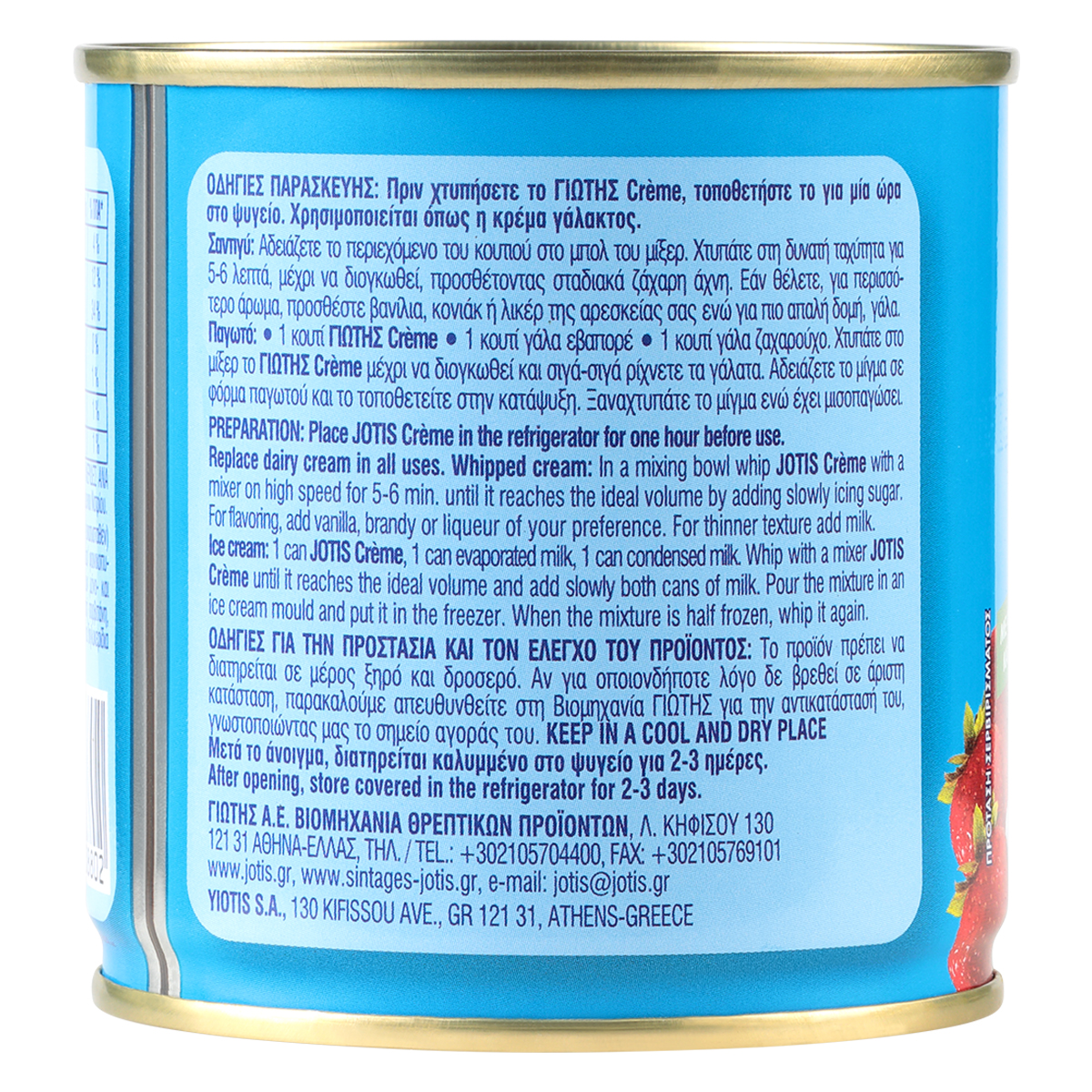 Το ΓΙΩΤΗΣ Creme έρχεται να συμπληρώσει τη γκάμα της ΓΙΩΤΗΣ στην κατηγορία υποκατάστατου σαντιγί, εμπλουτίζοντας τη σειρά των υλικών ζαχαροπλαστικής. Χρησιμοποιείται όπως η κρέμα γάλακτος και είναι ιδανικό για την παρασκευή γλυκών, όπως παγωτά, γλυκά ψυγείου, κορμοί, τούρτες. Εύκολο στη χρήση, χρειάζεται μόνο προσθήκη άχνης ζάχαρης και χτύπημα για 5 λεπτά σε απλό μίξερ. Είναι προϊόν με φυτικά λιπαρά, άπαχο γάλα και δεν περιέχει συντηρητικά.