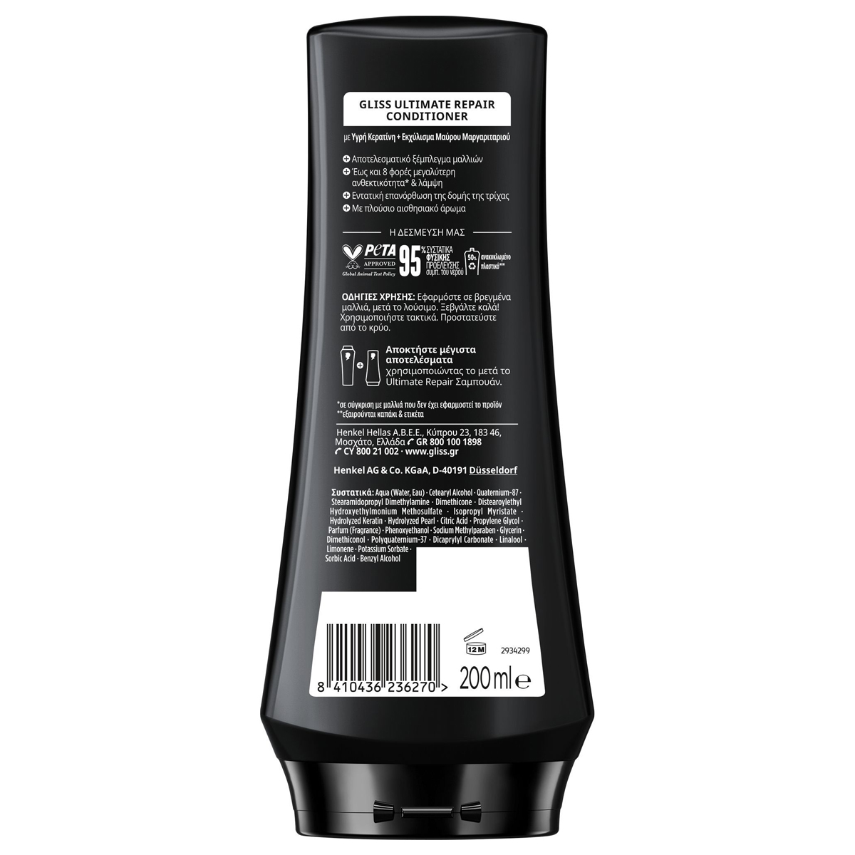 Schwarzkopf Gliss Conditioner Ενδυνάμωσης Ultimate Repair 200 ml - Για πολύ ταλαιπωρημένα, ξηρά μαλλιά. Gliss Care Level: 3 - Εντατική φροντίδα, με φόρμουλες επανόρθωσης και συστατικά υψηλής απόδοσης. Αυτό το conditioner με κερατίνη προσφέρει εντατική επανόρθωση της δομής της τρίχας και έως και 8 φορές μεγαλύτερη ανθεκτικότητα & λάμψη. Προσφέρει πιο αποτελεσματικό ξέμπλεγμα. Λειαίνει και μαλακώνει τα μαλλιά, αφήνει τα μαλλιά πιο ανθεκτικά και με υγιή όψη. Με πλούσιο αισθησιακό άρωμα. Το 95% των συστατικών είναι φυσικής προέλευσης. Τα προϊόντα μαλλιών Gliss είναι εγκεκριμένα από την PETA.