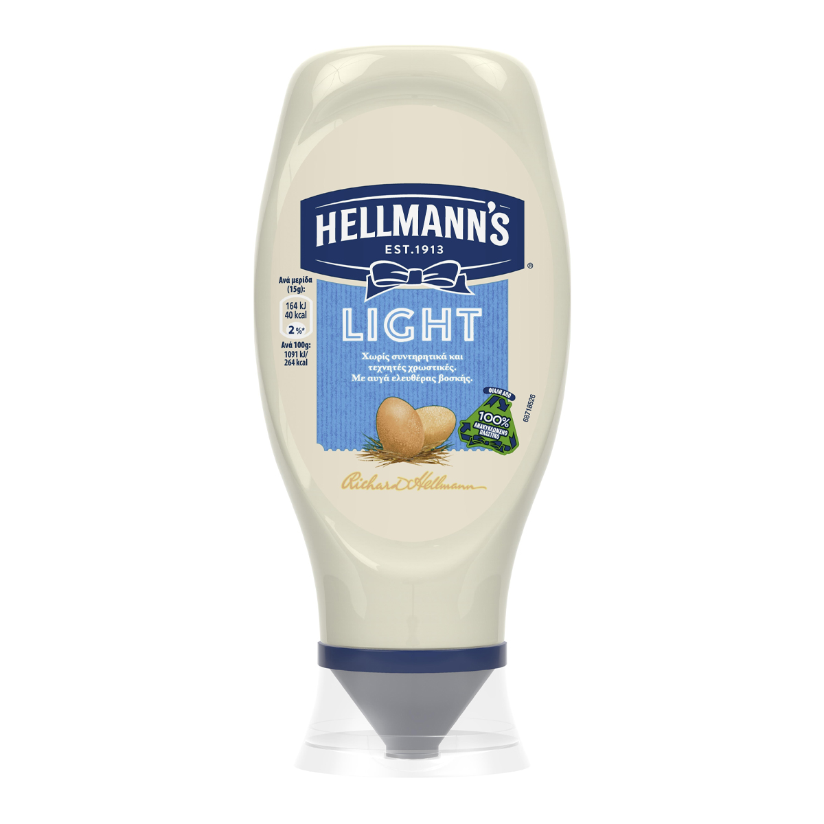 Η Hellmann's Light 430 ml περιέχει λιγότερες από τις μισές θερμίδες και τα λιπαρά της real Μαγιονέζας και μόνο 41 θερμίδες ανά κουταλιά. Αλλά ποτέ δεν θα μάθετε αν δεν την δοκιμάσετε. Για όσους προσέχουν τη γραμμή τους, αλλά δε θέλουν να στερηθούν τις αγαπημένες τους συνήθειες, τώρα σε πρωτοποριακό μπουκάλι Hellmann’s, όπου κάθε σταγόνα παραμένει υπέροχη όπως και η πρώτη! Το μοναδικό ΚΑΘΑΡΟ ΚΑΠΑΚΙ έχει σχεδιαστεί, ώστε να διατηρεί την πλούσια γεύση της Hellmann's μας αναλλοίωτη.