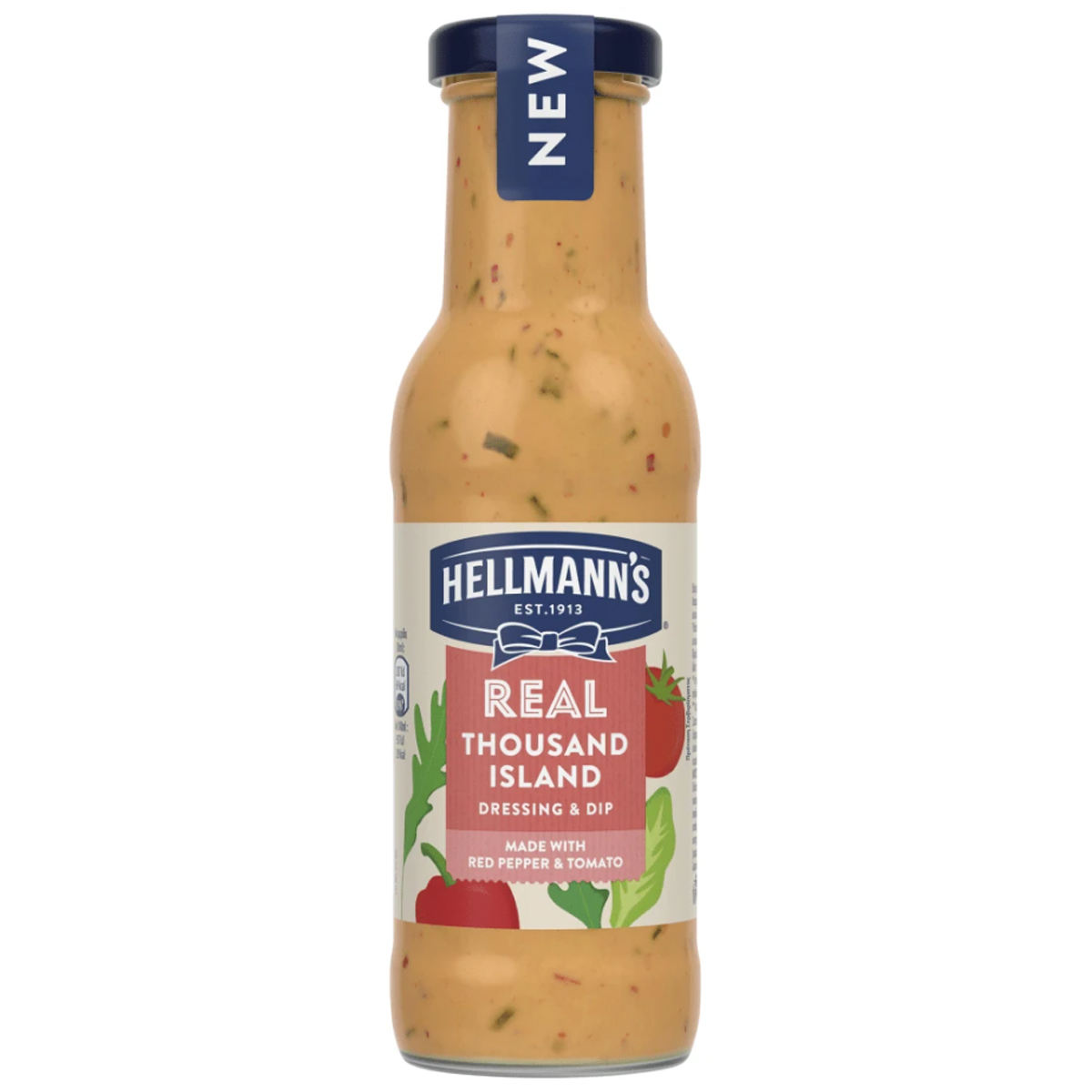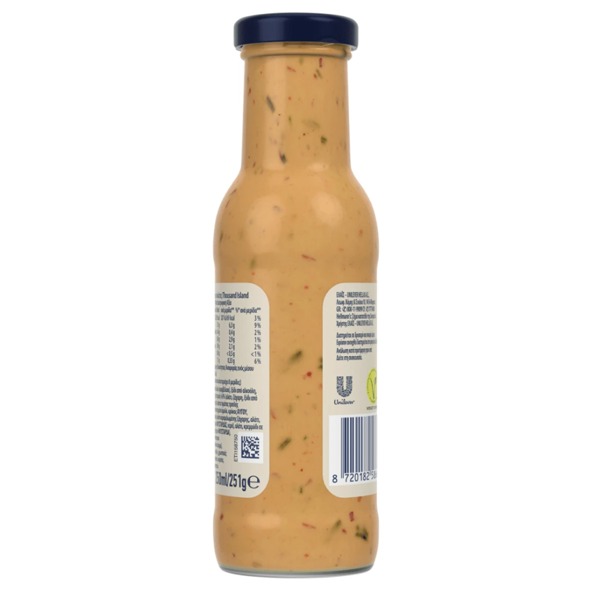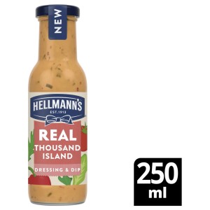 H Hellmann's Thousand Island σάλτσα για σαλάτα θα προσθέσει μια πικάντικη γεύση στην σαλάτα σας με την κρεμμώδη της υφή. Φυσικά, θα ταιριάξει υπέροχα με ένα σάντουιτς, με γαρίδες είτε ως ντιπ για τα πατατάκια σας.