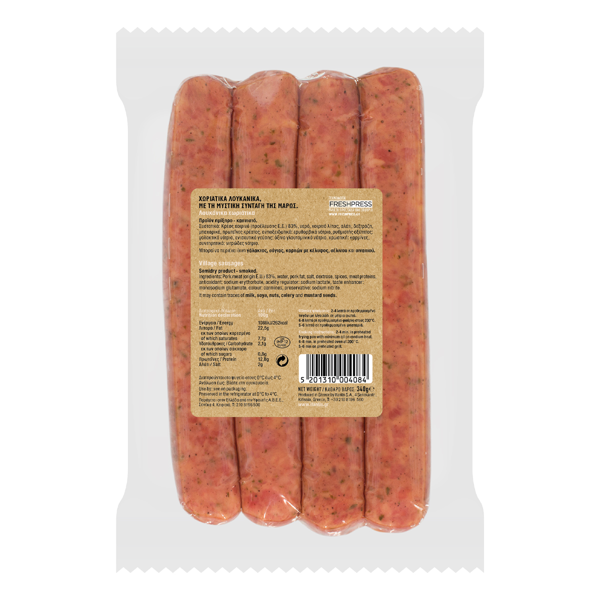 Χωριάτικα ζουμερά λουκάνικα με λαχταριστή γεύση, ζυμωμένα με τη μυστική συνταγή της Μάρως. Περιέχουν μόνο εκλεκτά κομμάτια κρέατος, επιλεγμένες πρώτες ύλες και μυρωδικά από την ελληνική γη. Σε συσκευασία 340 γραμμαρίων, με 4 λουκάνικα.