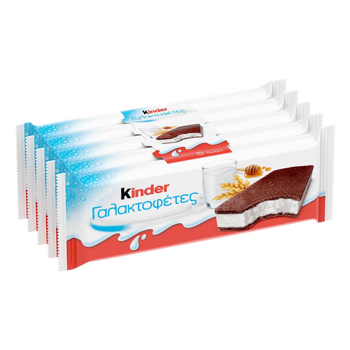 Οι Kinder Γαλακτοφέτες είναι ένα σνακ με απλή και φρέσκια γεύση, φτιαγμένο από παστεριωμένο γάλα, απλό και αγνό συστατικό. Απαλή και ελαφριά κρέμα από γάλα με μια σταγόνα μέλι ανάμεσα σε δύο λεπτά στρώματα αφράτου κέικ. Οι Kinder Γαλακτοφέτες λόγω των αγνών συστατικών και της απουσίας πρόσθετων συντηρητικών διατηρούνται μόνο στο ψυγείο. Φυσικά, χωρίς χρωστικά πρόσθετα.