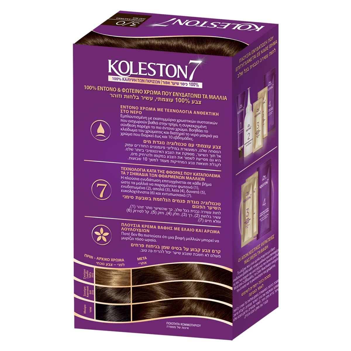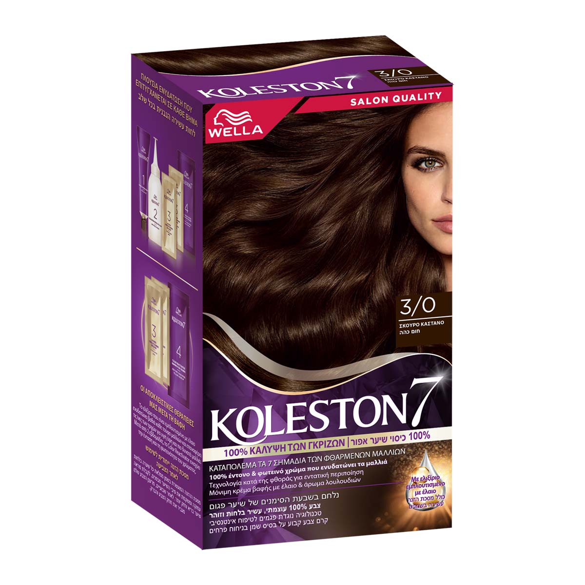 Νέα KOLESTON Κρέμα βαφή 3/0 - Σκούρο Καστανό για 100% κάλυψη των γκρίζων, με ελιξίριο εμπλουτισμένο με έλαιο και βελτιωμένη σύνθεση για πλούσια ενυδάτωση που επιτυγχάνεται σε κάθε βήμα. Με τεχνολογία ανθεκτική στο νερό, εμπλουτισμένη με εκατομμύρια χρωστικών συστατικών που εισχωρούν βαθιά στην τρίχα, η συγκεκριμένη σύνθεση παρέχει το πιο έντονο χρώμα. Βοηθάει το κλείδωμα του χρώματος και διατηρεί το νερό μακριά, για χρώμα που διαρκεί έως και 10 εβδομάδες. Καταπολεμά τα 7 σημάδια των φθαρμένων μαλλιών, ώστε τα μαλλιά να παραμένουν φωτεινά, ενυδατωμένα, απαλά, λεία, δυνατά, ευκολοχτένιστα και εντυπωσιακά. Με υπέροχο άρωμα λουλουδιών