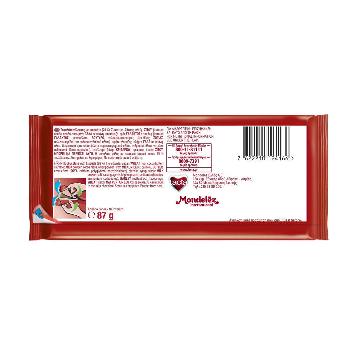 Η σοκολάτα που κατάφερε να γίνει το πιο γλυκό κομμάτι της ζωής μας! Ακαταμάχητος συνδυασμός σοκολάτας γάλακτος Lacta με κομμάτια τραγανού μπισκότου που θα σας παρασύρει σε μία απολαυστική γευστική εμπειρία.