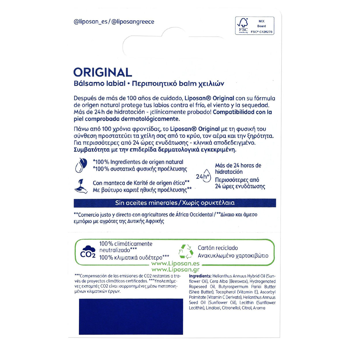 Θέλεις κλασική, ενυδατική φροντίδα χειλιών για καθημερινή χρήση; Το Original θρέφει σε βάθος τα χείλη με την καινοτόμο φόρμουλα αποθήκευσης της υγρασίας του Liposan και με μια ανάλαφρη υφή για καθημερινή χρήση. Χρησιμοποίησε αυτό το αποτελεσματικό προϊόν για ολοκληρωμένη προστασία, για χείλη απαλά και λεία, έτοιμα για φίλημα. Το κλασικό άρωμα ευχαριστεί τις αισθήσεις. Εμπλουτισμένο με έλαιο jojoba και shea butter, ενυδατώνει φυσικά τα χείλη, ώστε να τα αισθάνεσαι αλλά και να δείχνουν υπέροχα!