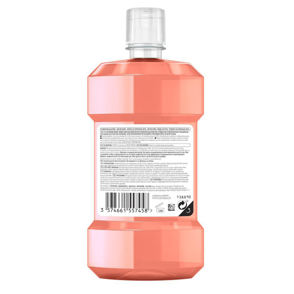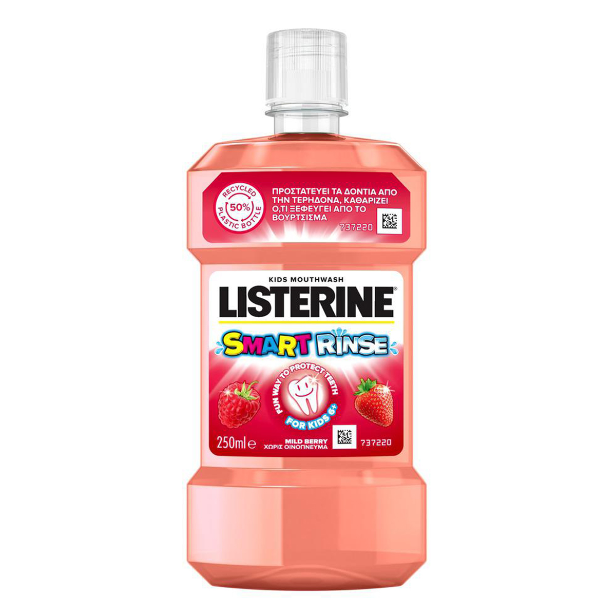 Το LISTERINE SMART RINSE είναι ένα φθοριούχο στοματικό διάλυμα που συμβάλλει στην προστασία των δοντιών του παιδιού σας από την τερηδόνα, όταν χρησιμοποιείται δύο φορές την ημέρα μετά το βούρτσισμα. Περιέχει φθόριο, το οποίο ενδυναμώνει τα δόντια και μειώνει την τερηδόνα μέχρι και 40% περισσότερο σε σχέση με το βούρτσισμα μόνο. Καταπολεμά τα βλαβερά βακτήρια, την κύρια αιτία της πλάκας και της ουλίτιδας. Φτάνει σε ολόκληρο το στόμα, τα δόντια, τα ούλα και τη γλώσσα. Παρασύρει και χρωματίζει τα υπολείμματα των τροφών που παραμένουν μετά το βούρτσισμα, αποκαλύπτοντας στο παιδί σας το αποτέλεσμα στον νιπτήρα. ΔΕΝ ΠΕΡΙΕΧΕΙ ΟΙΝΟΠΝΕΥΜΑ.