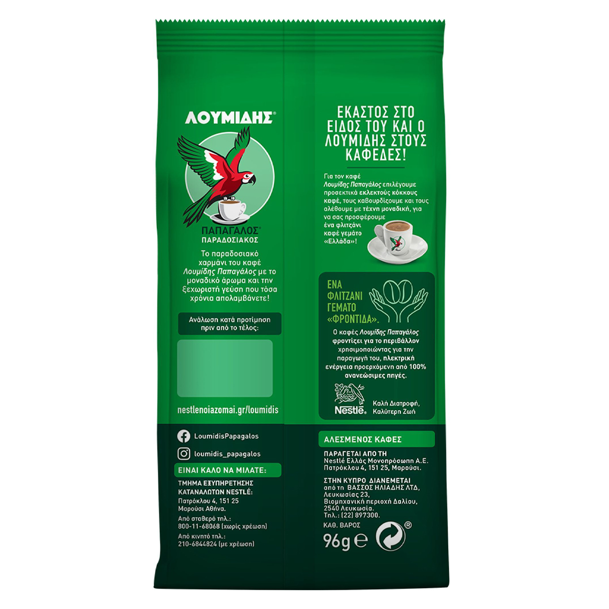 Ο αγαπημένος ελληνικός καφές ΛΟΥΜΙΔΗΣ® ΠΑΠΑΓΑΛΟΣ® τώρα πιο ανανεωμένος από ποτέ με νέο εικαστικό και λογότυπο, όμως με το ίδιο αγαπημενο ,εκλεκτό και άριστης ποιότητας χαρμάνι. Με το μοναδικό άρωμα και τη ξεχωριστή γεύση που τόσα χρώνια απολαμβάνετε! Μας συντροφεύουν απο το 1920 και μας ενώνουν με όλα όσα αγαπάμε.. τους ανθρώπους και τον Τόπο μας. ΛΟΥΜΙΔΗΣ® ΠΑΠΑΓΑΛΟΣ® ενα φλίτζάνι γεμάτο "Ελλάδα". Ο καφές Λουμίδης Παπαγάλος φροντίζει για το περιβάλλον χρησιμοποιώντας για την παραγωγή του, ηλεκτρική ενέργεια προερχόμενη απο 100% ανανεώσιμες πηγές. Αλεσμένος καφές. 100% φυσικός καφές.