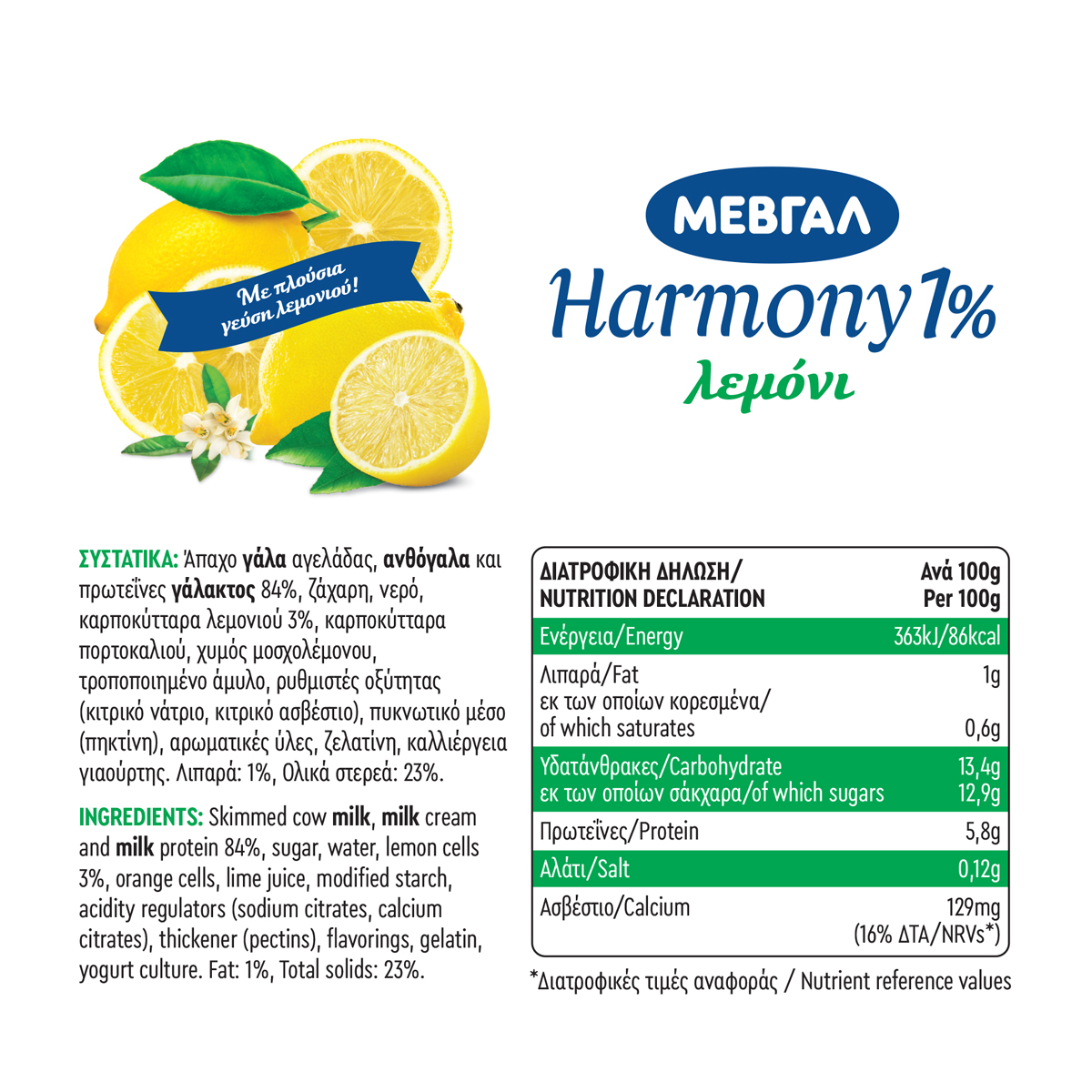 Το επιδόρπιο γιαουρτιού HARMONY με μόλις 1% λιπαρά και 168 θερμίδες (ανά τεμάχιο 200 gr), τα λαχταριστά κομμάτια φρούτων και την πλούσια γεύση του θα γίνει αναπόσπαστο κομμάτι της υγιεινής σας διατροφής.