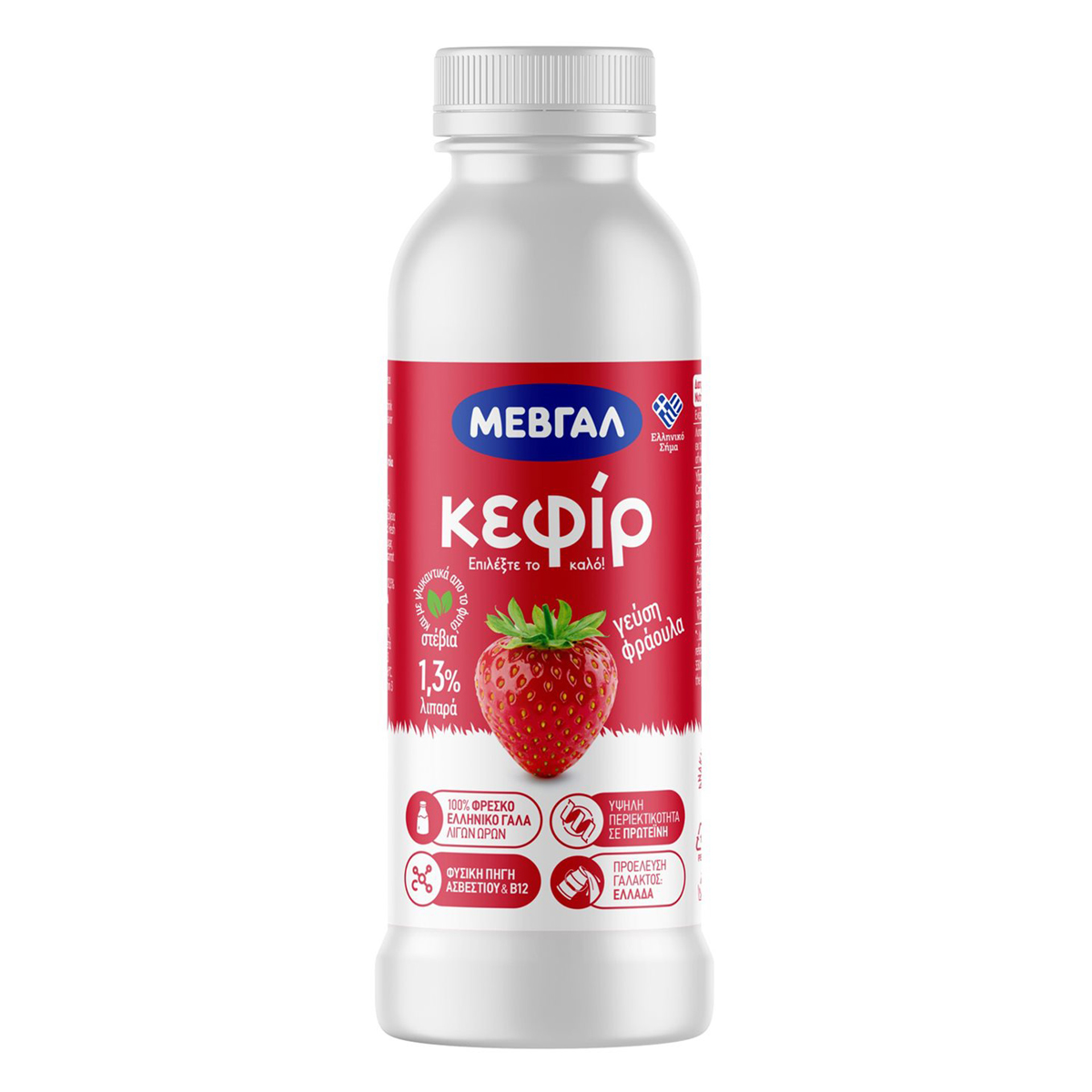 Το φρέσκο ελληνικό γάλα, σε συνδυασμό με την καλλιέργεια κεφίρ, δρουν ευεργετικά για τη χλωρίδα του εντέρου και εξασφαλίζουν την καλή υγεία του πεπτικού μας συστήματος. Με λαχταριστή φρουτένια γεύση, το Κεφίρ με Φράουλα της ΜΕΒΓΑΛ αποτελεί ένα απολαυστικό, θρεπτικό ρόφημα για άτομα κάθε ηλικίας.