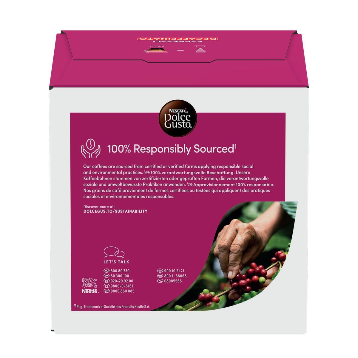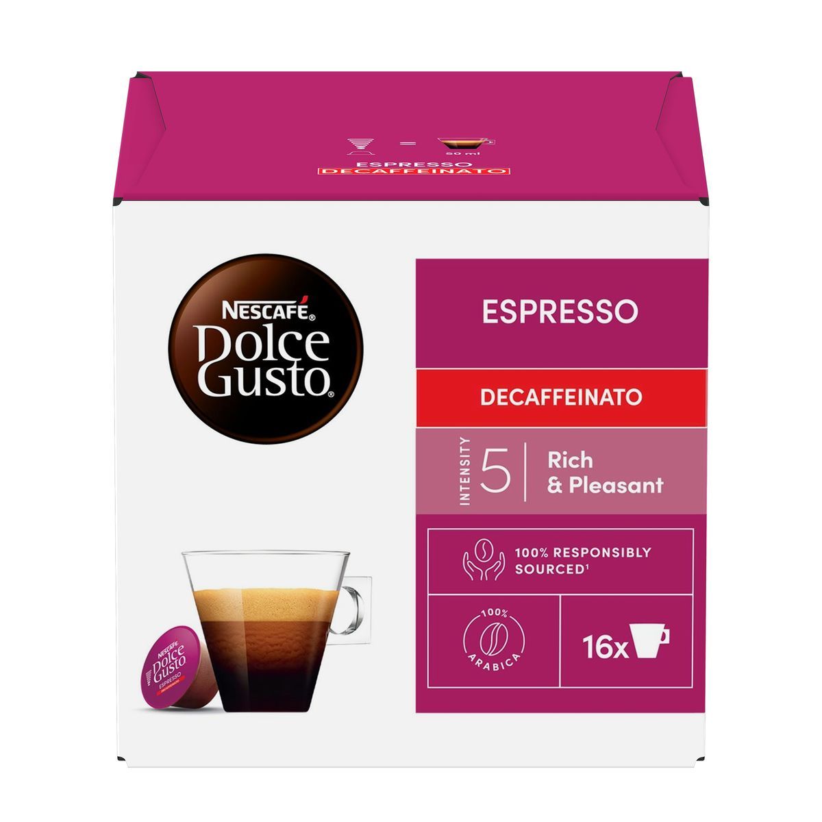 Ο Espresso Decaffeinato είναι μια δημιουργία καφέ που αποτελείται αποκλειστικά από κόκκους καφέ ποικιλίας Arabica που προέρχονται από δύο διαφορετικές περιοχές της Νοτίου Αμερικής (Κολομβία, Βραζιλία). Ένα εξαιρετικό χαρμάνι ελαφριά καβουρδισμένο, εντάσεως 5. Απόλυτη αρμονία, από νότες ψημένων δημητριακών και κόκκιvων φρούτων, που αναδεικνύεται σε ένα ισορροπημένο ρόφημα χωρίς καφεΐνη. Η αποκαφεϊνοποίηση γίνεται με φυσικό τρόπο, μόνο με νερό, προκειμένου να διατηρούνται αναλλοίωτα όλα τα χαρακτηριστικά του καφέ. Ανακάλυψε στον NESCAFE® Dolce Gusto® Espresso Decaffeinato, έναν καφέ με ακόμα πιο πλούσια κρέμα και εκλεπτυσμένη γεύση. Συμβατές με μηχανή Nescafe Dolce Gusto.