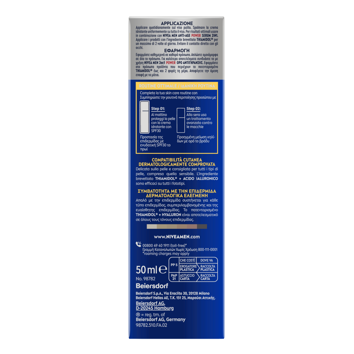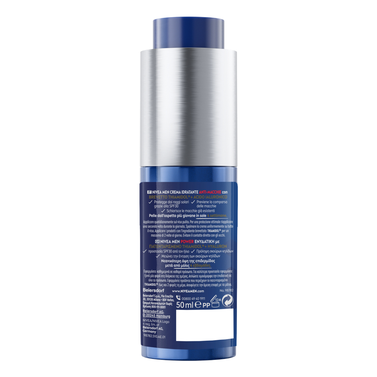 Η NIVEA MEN Anti-Age Power Ενυδατική Κρέμα Προσώπου συνδυάζει το πατενταρισμένο συστατικό Thiamidol® και την Hyaluron στοχεύοντας αποτελεσματικά τις σκούρες κηλίδες, ενώ παράλληλα παρέχει αντηλιακή προστασία SPF30 και προστασία κατά της γήρανσης. Αυτή η καινοτόμος σύνθεση, που αναπτύχθηκε μετά από 10 χρόνια έρευνας, μειώνει ορατά την εμφάνιση και το μέγεθος των σκούρων κηλίδων και αποτρέπει την επανεμφάνισή τους, χαρίζοντας στην επιδερμίδα μια πιο λεία και νεανική όψη. Η ελαφριά υφή της είναι ειδικά σχεδιασμένη για την ανδρική επιδερμίδα, προσφέροντας εύκολη εφαρμογή χωρίς λιπαρά υπολείμματα. Δερματολογικά ελεγμένη, αυτή η ενυδατική κρέμα ενισχύει τη λάμψη της επιδερμίδας και βελτιώνει ορατά την όψη της μέσα σε 4 εβδομάδες για ισχυρή καθημερινή φροντίδα: Ενυδατική κρέμα NIVEA MEN Anti-Age Power Moisturizer.