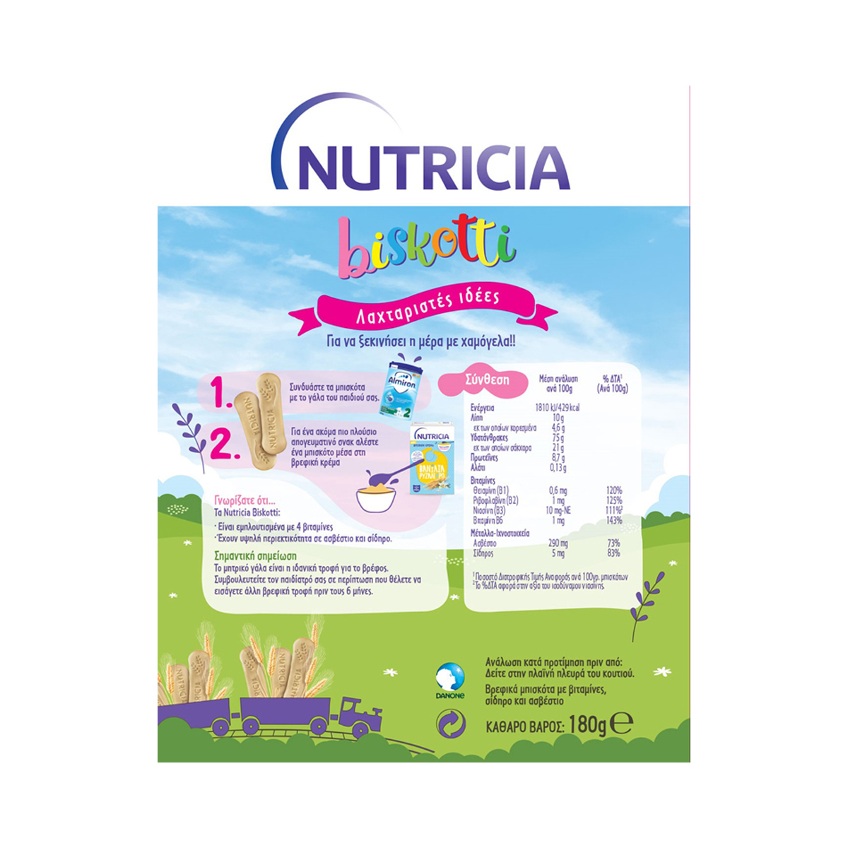 Η Nutricia προσφέρει τα μοναδικά βρεφικά μπισκότα Nutricia Biskotti που: Είναι κατάλληλα για βρέφη 6+ μηνών. Είναι εμπλουτισμένα με 4 βιταμίνες. Έχουν υψηλή περιεκτικότητα σε ασβέστιο και σίδηρο.