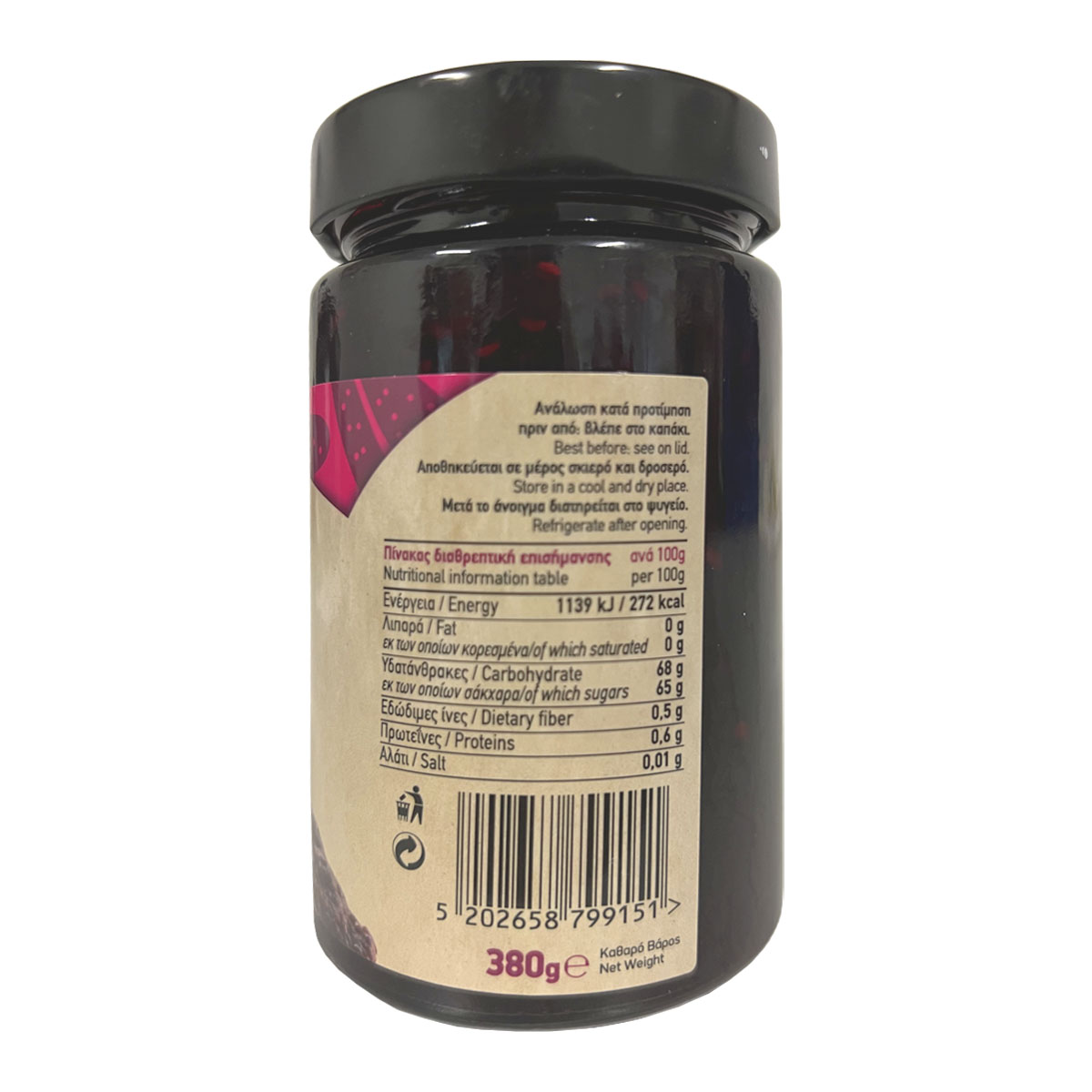Περιέχει 55γρ. φρούτου ανά 100γρ. προϊόντος, ζάχαρη, σιρόπι γλυκόζης - φρουκτόζης, πηκτωματογόνο: Πηκτίνη, μέσο οξίνισης: Κιτρικό οξύ, ολική περιεκτικότητα σε σάκχαρα 65g/100g.