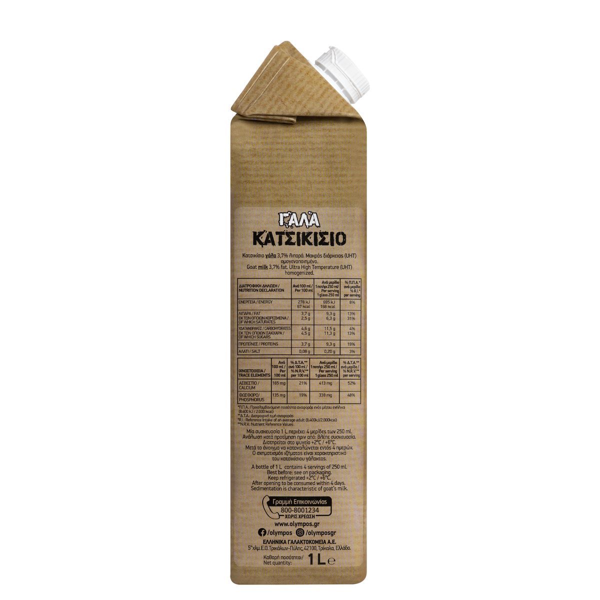Το κατσικίσιο γάλα ΟΛΥΜΠΟΣ με 3,7% λιπαρά παράγεται από 100% ελληνικό κατσικίσιο γάλα.