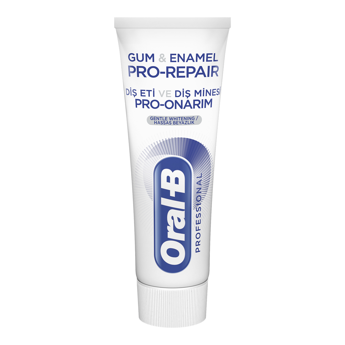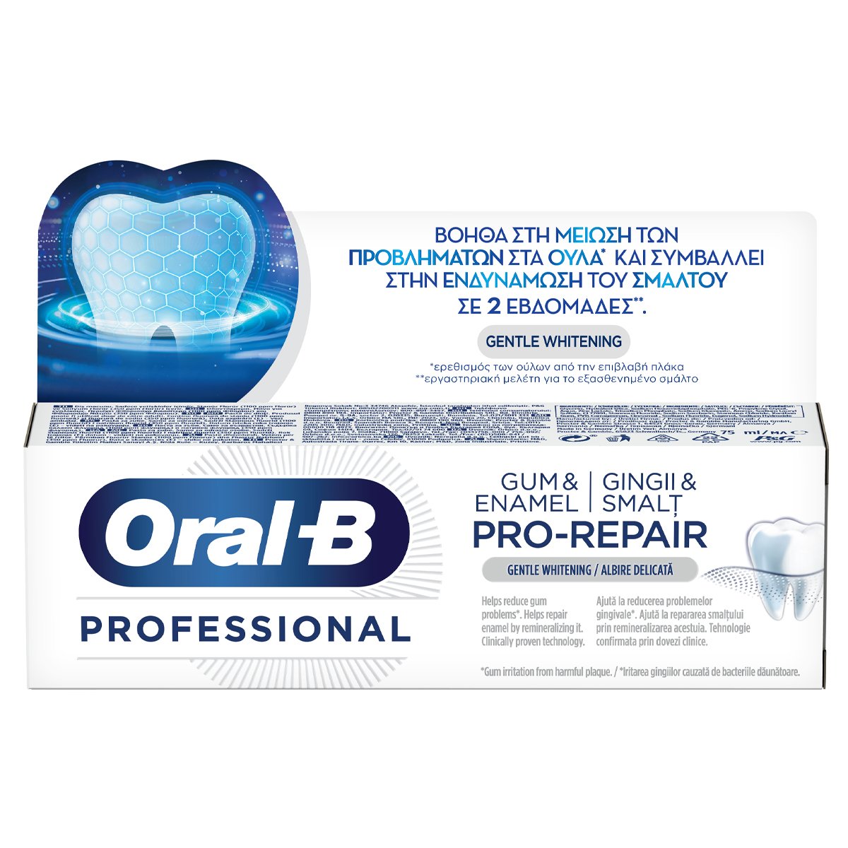 Η οδοντόκρεμα Oral-B Professional Gum & Enamel Pro-Repair βοηθά στην πρόληψη κατά των προβλημάτων στα ούλα* και στην επανόρθωση του σμάλτου. *προβλήματα στα ούλα από την επιβλαβή βακτηριακή πλάκα.