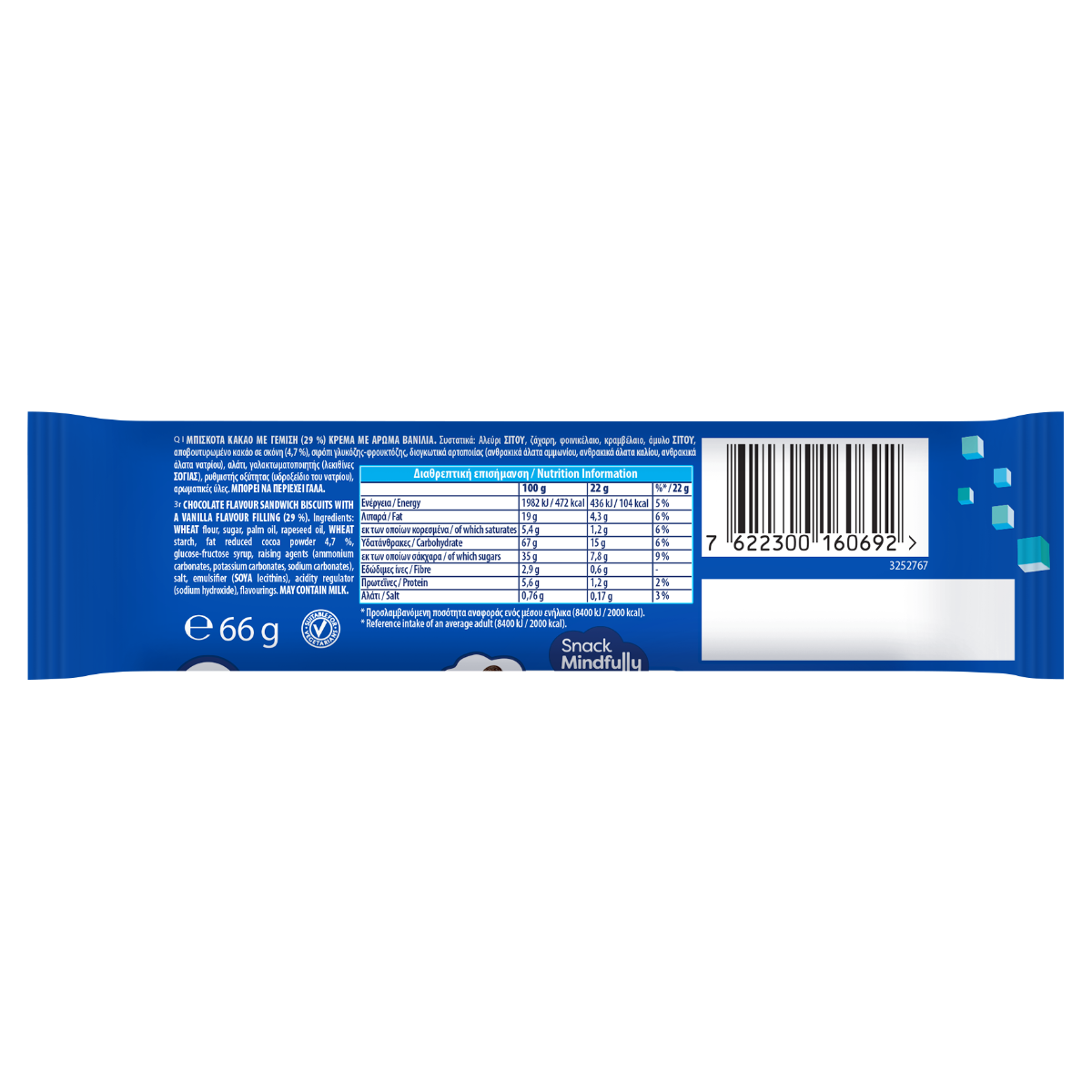 Το OREO Original αποτελείται από δύο τραγανά μπισκότα με πλούσια γεύση κακάο και μία στρώση απολαυστικής κρέμας με άρωμα βανίλια, δημιουργώντας τον πιο ξεχωριστό συνδυασμό. Παρασκευάζεται με αυθεντικό κακάο, προσφέροντας μία γευστική εμπειρία που ξυπνάει την παιχνιδιάρικη διάθεση μέσα μας! Το γεμιστό μπισκότο OREO είναι το ιδανικό σνακ για το σπίτι, τη δουλειά, το γραφείο ή όσο βρίσκεστε στο δρόμο. Η μικρή και εύχρηστη συσκευασία των 66g κάνει το OREO κατάλληλο για να το έχεις πάντα μαζί σου, να το μεταφέρεις εύκολα και να το μοιράζεσαι με τους αγαπημένους σου.