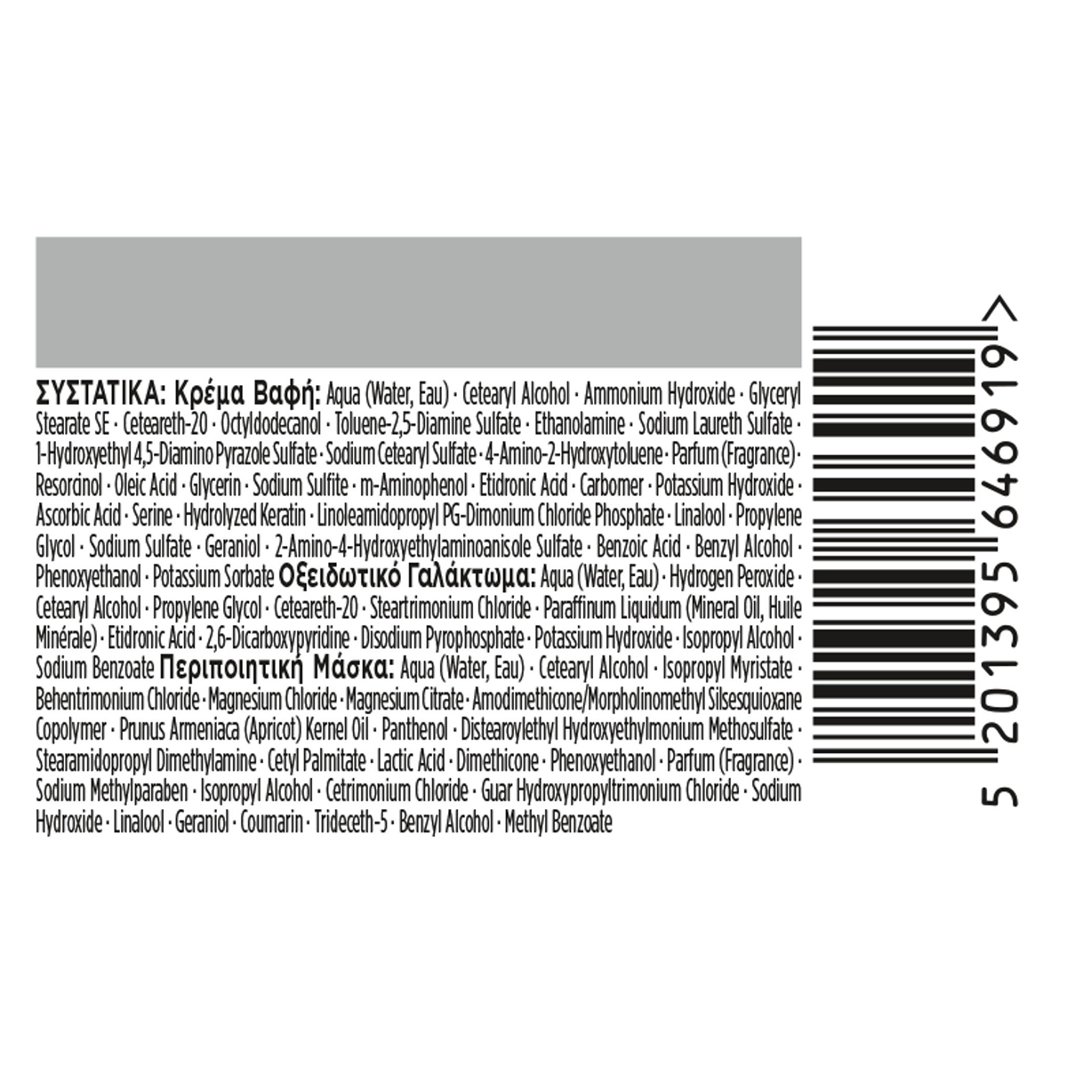 Hair Color, Toner, oxidative dyes:Aqua (Water, Eau), Cetearyl Alcohol, Ammonium Hydroxide, Glyceryl Stearate SE, Ceteareth-20, Octyldodecanol, Toluene-2,5-Diamine Sulfate, Ethanolamine, Sodium Laureth Sulfate, 1-Hydroxyethyl 4,5-Diamino Pyrazole Sulfate, Sodium Cetearyl Sulfate, 4-Amino-2-Hydroxytoluene, Parfum (Fragrance), Resorcinol, Oleic Acid, Glycerin, Sodium Sulfite, m-Aminophenol, Etidronic Acid, Carbomer, Potassium Hydroxide, Ascorbic Acid, Serine, Linoleamidopropyl PG-Dimonium Chloride Phosphate, Propylene Glycol, Sodium Sulfate, 2-Amino-4-Hydroxyethylaminoanisole Sulfate, Benzyl Salicylate, Benzoic Acid, Benzyl Alcohol|Conditioner, rinse off:Aqua (Water, Eau), Cetearyl Alcohol, Behentrimonium Chloride, Dimethicone, Amodimethicone, Morpholinomethyl Silsesquioxane Copolymer, Magnesium Citrate, Magnesium Chloride, Hydrolyzed Keratin, Polyquaternium-37, Macadamia Ternifolia Seed Oil, Panthenol, Isopropyl Myristate, Citric Acid, Phenoxyethanol, Stearamidopropyl.