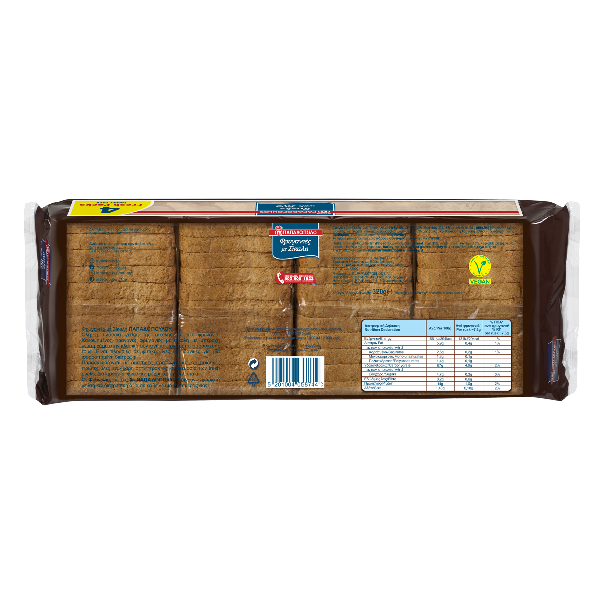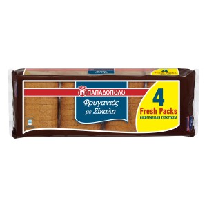 Φρυγανιές με Σίκαλη Παπαδοπούλου. Όλη η πλούσια γεύση της σίκαλης σε μια ξεχωριστή φρυγανιά. Πολύ τραγανές, γευστικές φρυγανιές με εκλεκτή σίκαλη, για γεύση που πραγματικά ξεχωρίζει. Παρασκευάζονται με τον παραδοσιακό τρόπο και χάρη στην εύχρηστη συσκευασία των fresh packs, διατηρούνται πάντα φρέσκες. Νόστιμες και θρεπτικές, οι Φρυγανιές με Σίκαλη Παπαδοπούλου μπορούν να αποτελέσουν μέρος μίας καθημερινής ισορροπημένης διατροφής.