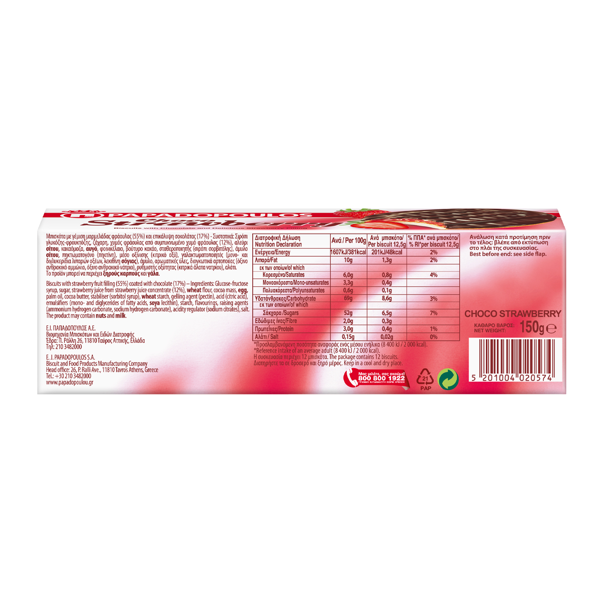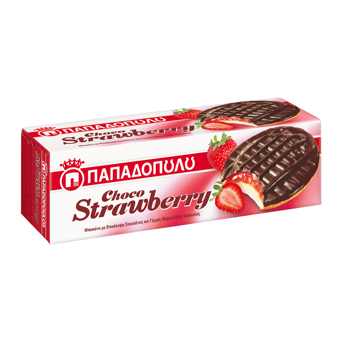 Μπισκότα με επικάλυψη πραγματικής σοκολάτας και γέμιση μαρμελάδας φράουλα.