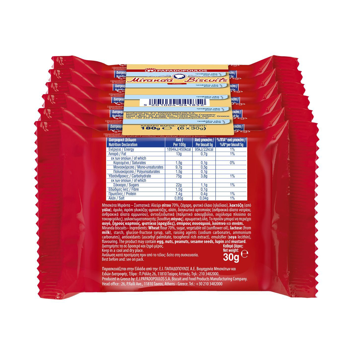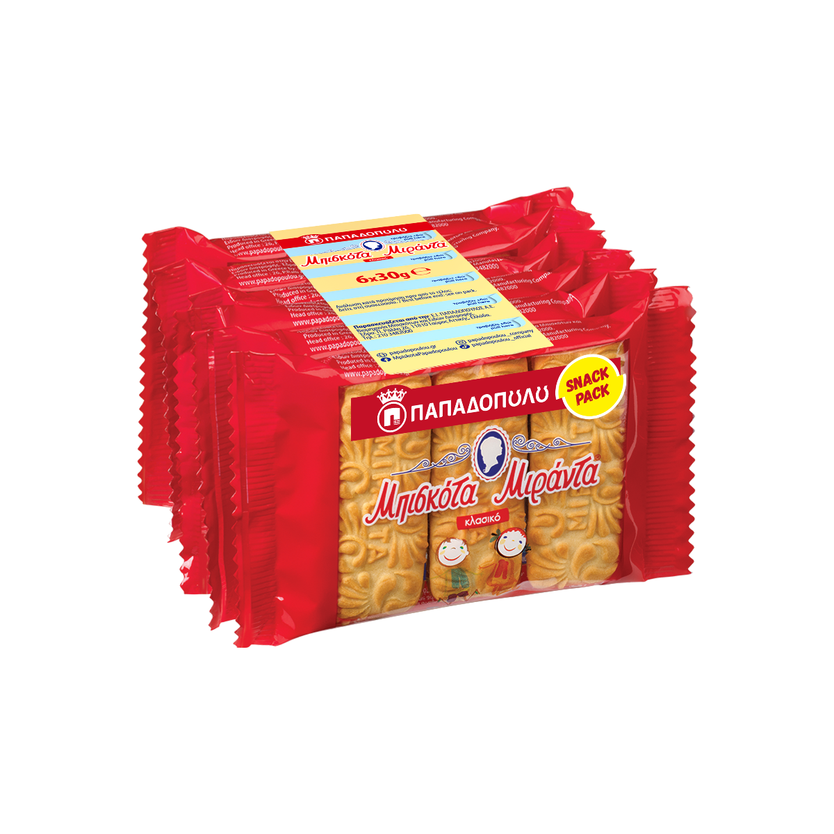 Τα Μπισκότα Μιράντα είναι τα αγαπημένα μπισκότα κάθε ηλικίας που συνδυάζουν την απόλαυση με ευχάριστες αναμνήσεις από τα παιδικά μας χρόνια. Με υψηλή περιεκτικότητα σε δημητριακά, σκέτο ή και με ροφήματα μπορεί να αποτελέσει ένα αγαπημένο σνακ στο πλαίσιο μιας ισορροπημένης διατροφής μικρών και μεγάλων. Και σε συσκευασια fresh pack, ώστε να μπορουν οι μικροί μας φίλοι να τα απολαμβανουν οποιαδήποτε στιγμή από το σχολικό διάλειμμα μεχρι τη βόλτα.