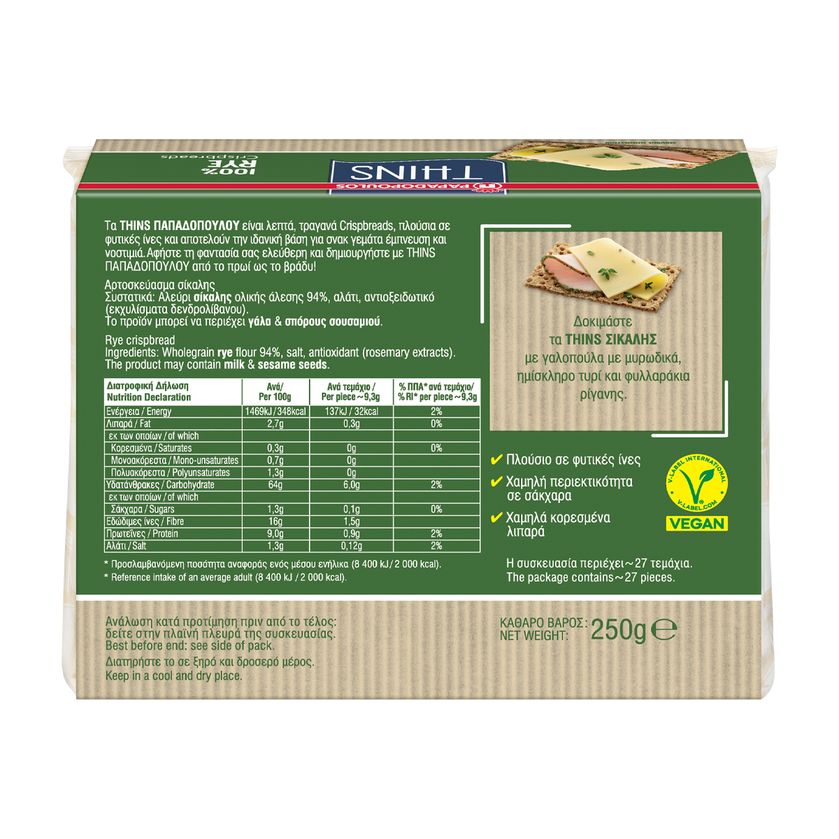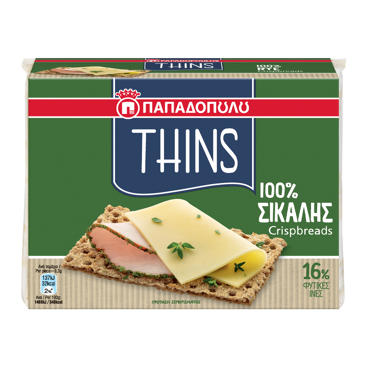 Τα ΤΗINS Kλασικά είναι λεπτά και τραγανά Crispbreads, που φτιάχνονται αποκλειστικά από αλεύρι σίκαλης ολικής άλεσης. Έχουν 16% φυτικές ίνες, χαμηλά κορεσμένα λιπαρά και χαμηλή περιεκτικότητα σε σάκχαρα και 32 kcal ανά τεμάχιο. Συνδυάζονται αρμονικά με γλυκά και αλμυρά toppings, δημιουργώντας υγιεινά και απολαυστικά σνακ για όλη την ημέρα.