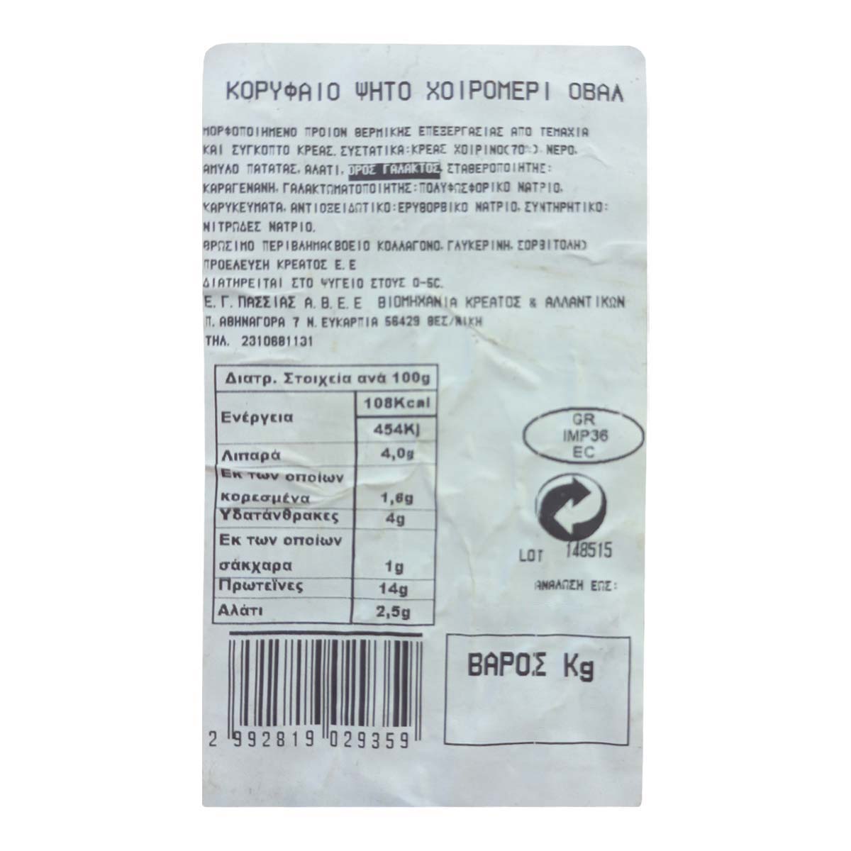 Κρέας χοιρρινό (70%), νερό, άμυλο πατάτας, αλάτι, ορός ΓΑΛΑΚΤΟΣ, σταθεροποιητής: καραγενάνη, γαλακτωματοποιητής: πολυφωσφωρικό νάτριο, καρυκεύματα, αντιοξειδοτικό: ερυθορβικό νάτριο, συντηρητικό: νιτρώδες νάτριο. Βρώσιμο περίβλημα (βόειο κολλαγόνο, γλυκερίνη, σορβιτόλη). Προέλευση κρέατος Ε.Ε.