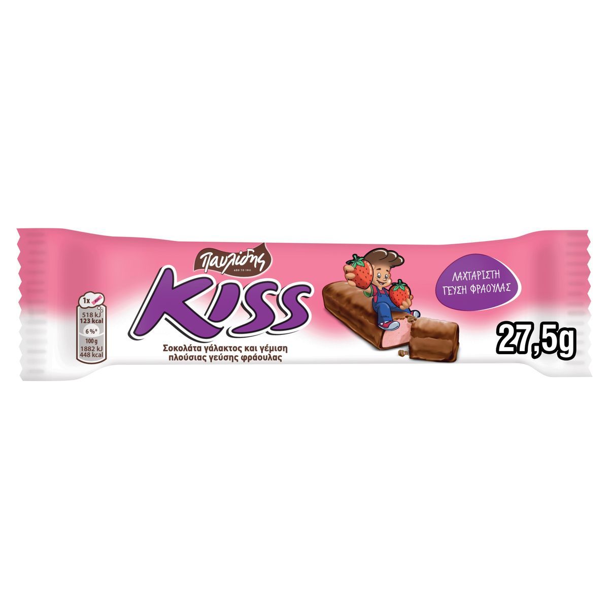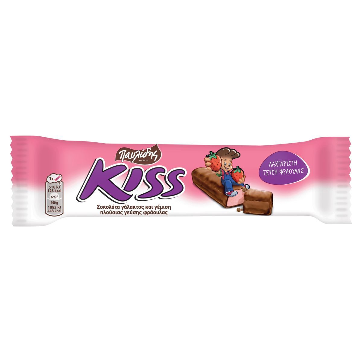 Απολαυστική μπάρα Kiss με επικάλυψη από σοκολάτα γάλακτος γεμιστή με κρέμα γεύση γάλα και φράουλα!
