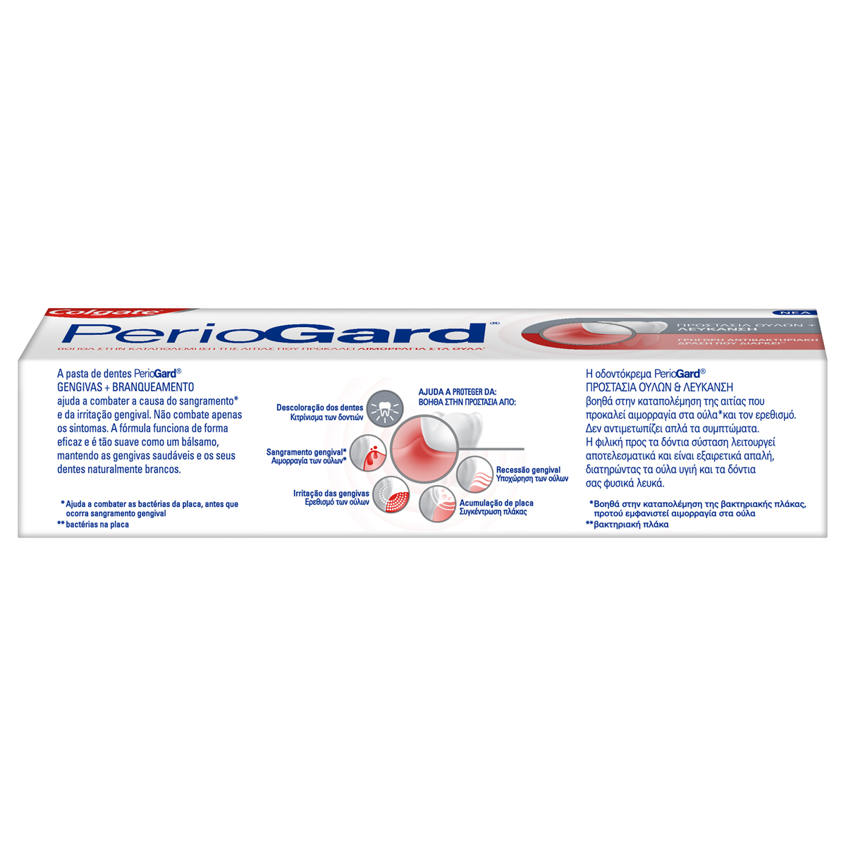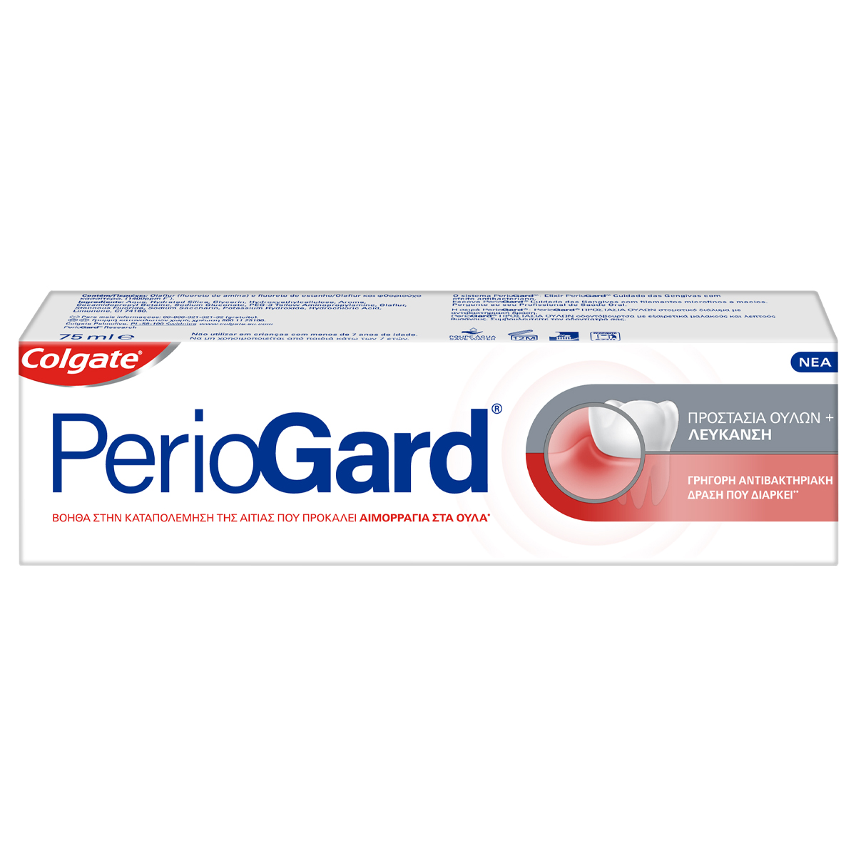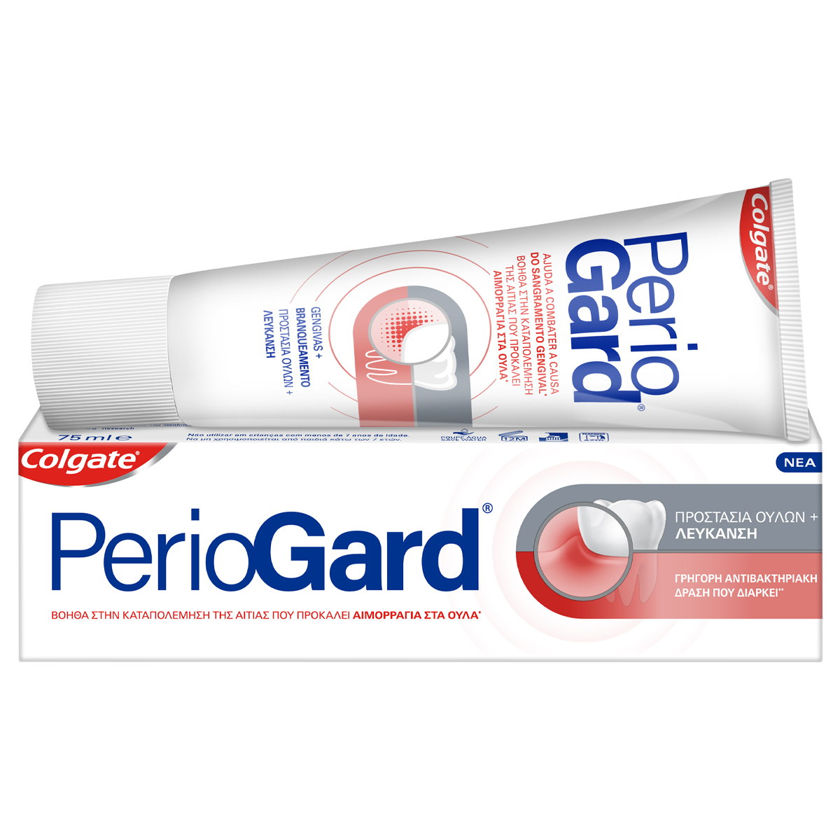 Η οδοντόκρεμα PerioGard ΠΡΟΣΤΑΣΙΑ ΟΥΛΩΝ & ΛΕΥΚΑΝΣΗ βοηθά στην καταπολέμηση της αιτίας που προκαλεί αιμορραγία στα ούλα* και τον ερεθισμό προτού εμφανιστεί. Δεν αντιμετωπίζει απλά τα συμπτώματα. Η φιλική προς τα δόντια σύσταση λειτουργεί αποτελεσματικά και είναι εξαιρετικά απαλή, διατηρώντας τα ούλα υγιή και τα δόντια σας φυσικά λευκά. *Βοηθά στην καταπολέμηση της βακτηριακής πλάκας, προτού εμφανιστεί αιμορραγία στα ούλα.