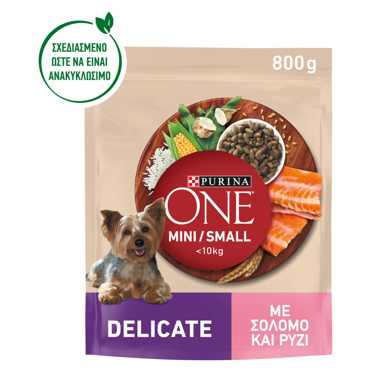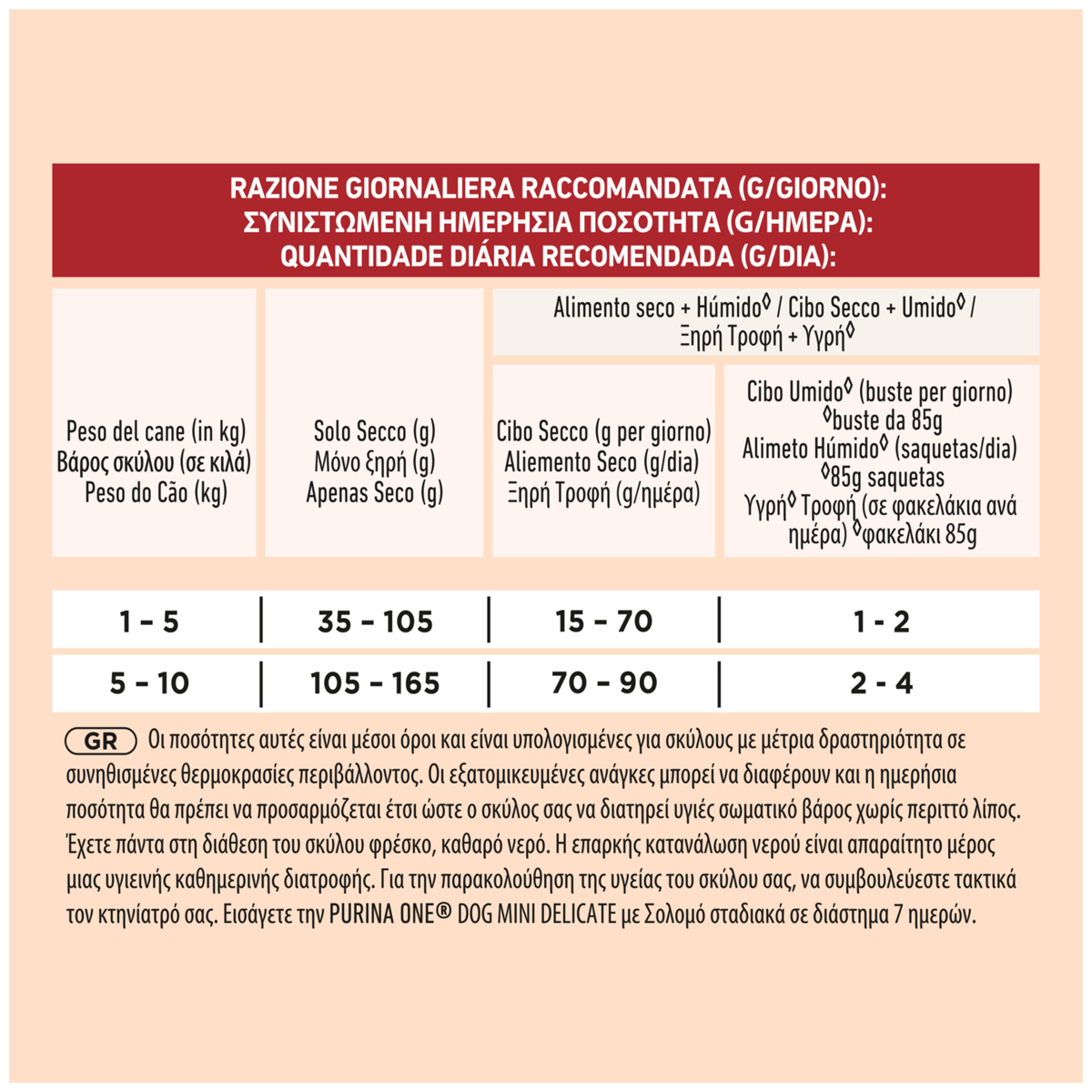 Ο μικρόσωμος σκύλος σας έχει ιδιαίτερες διατροφικές ανάγκες.. Για την καλή του υγεία είναι σημαντικό να έχει ένα ισορροπημένο μικροβίωμα εντέρου. Η ισορροπία των μικροοργανισμών είναι σημαντική για τη θετική τους επίδραση στην υγεία του πεπτικού και ανοσοποιητικού συστήματος και τη γενικότερη ευεξία του σκύλου σας. Γι'αυτό οι ειδικοί της Purina δημιούργησαν το Purina ONE® MINI/SMALL <10kg. Προσεκτικά επιλεγμένη, προηγμένη διατροφή σε ένα απολαυστικό γεύμα με μικρές τραγανές κροκέτες και πιο μαλακές μπουκιές*, ειδικά σχεδιασμένες για το μικρό στόμα του. Μπορείτε να προσφέρετε στο μικρόσωμο σκύλο σας νόστιμες συνταγές, σχεδιασμένες να ανταποκρίνονται στις διατροφικές του ανάγκες. Δοκιμάστε τη σειρά Purina ONE® MINI/SMALL <10kg για να δείτε τα ορατά αποτελέσματα στην καλή φυσική του κατάσταση. -Προσεκτικά επιλεγμένη, προηγμένη διατροφή που βοηθά στη διατήρηση ενός υγιούς μικροβιώματος του εντέρου. -Βοηθά στη διατήρηση μιας δυνατής φυσικής άμυνας χάρη σε έναν ειδικό συνδυασμό αντιοξειδωτικών και υψηλής ποιότητας πρωτεΐνης. -Υποστηρίζει την υγεία του δέρματος και του τριχώματος και βοηθά στη διαχείριση του ευαίσθητου δέρματος, χάρη στα υψηλά επίπεδα των ωμέγα 3 λιπαρών οξέων και του ψευδαργύρου. -Με ένα φυσικό πρεβιοτικό που αποδεδειγμένα βελτιώνει την υγεία του πεπτικού. -Ιδιαίτερα εύπεπτο χάρη στα υψηλής ποιότητας συστατικά. -Για ευαίσθητο δέρμα. Οι εξατομικευμένες ανάγκες μπορεί να διαφέρουν και η ημερήσια ποσότητα θα πρέπει να προσαρμόζεται έτσι ώστε ο σκύλος σας να διατηρεί υγιές σωματικό βάρος χωρίς περιττό λίπος. Έχετε πάντα στη διάθεση του σκύλου φρέσκο, καθαρό νερό. H επαρκής κατανάλωση νερού είναι απαραίτητο μέρος μιας υγιεινής καθημερινής διατροφής. Για την παρακολούθηση της υγείας του σκύλου σας, να συμβουλεύεστε τακτικά τον κτηνίατρό σας.