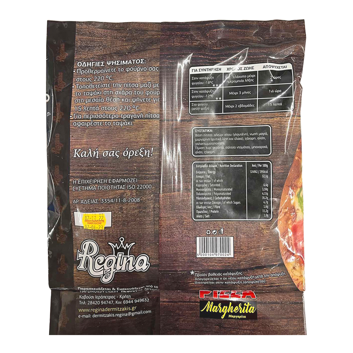 Βάση πίτσας: αλεύρι ΣΙΤΟΥ (ΓΛΟΥΤΕΝΗ), νωπή μαγιά, μαργαρίνη (φυτικά λίπη και έλαια), ζάχαρη, αλάτι, γαλακτωματοποιητής.