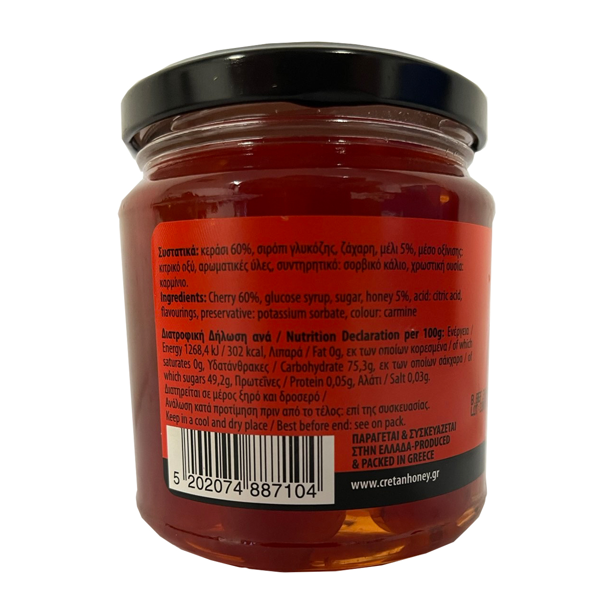 Κεράσι 60%, σιρόπι γλυκόζης, ζάχαρη, μέλι 5%, μέσο οξίνισης: κιτρικό οξύ, αρωματικές ύλες, συντηρητικό: σορβικό κάλιο, χρωστική ουσία: καρμίνιο.